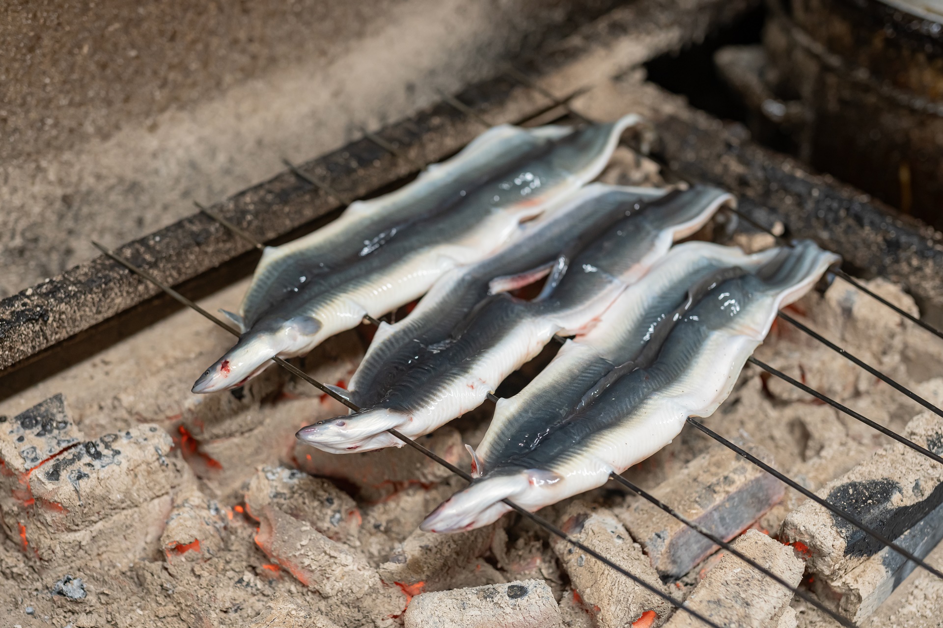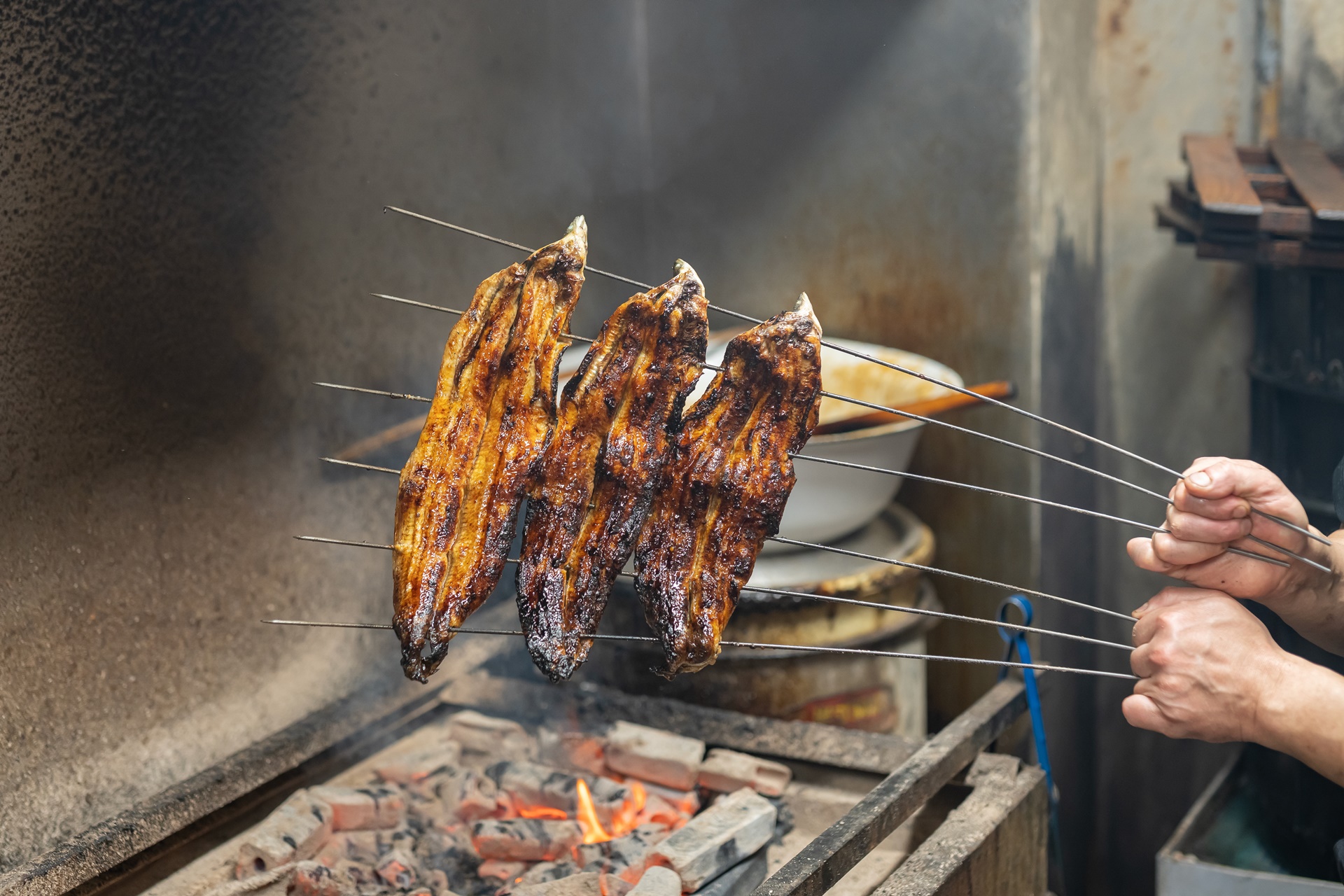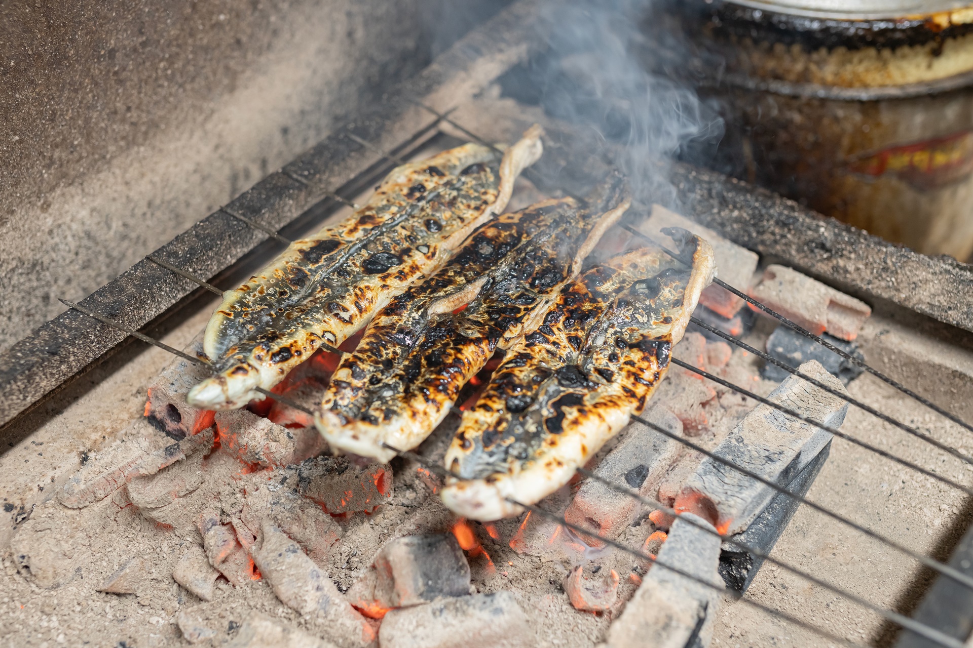빠르게 꼬치에 꽂은 장어는 잘 달궈진 숯불에 올려 천천히 구워냅니다.