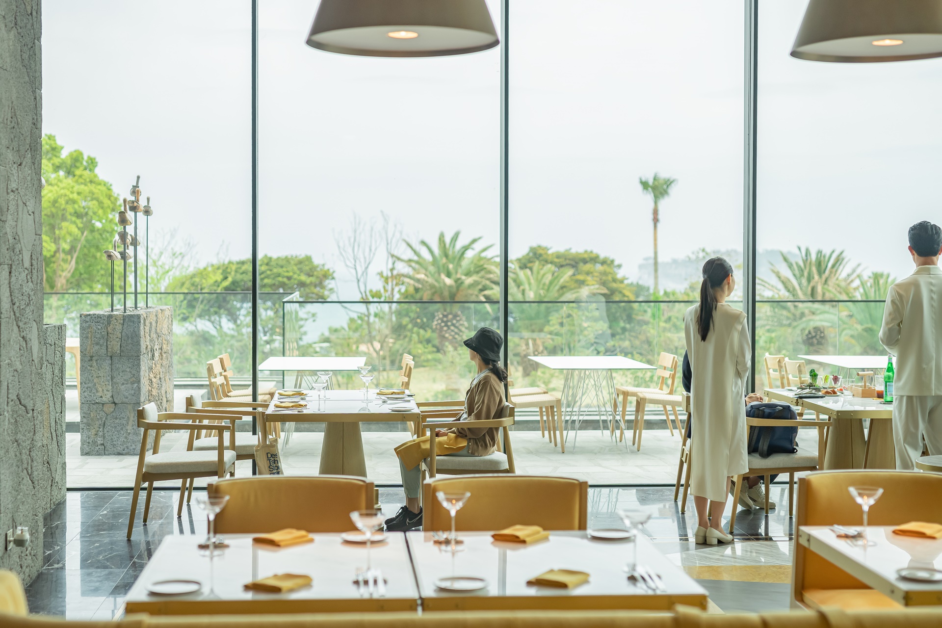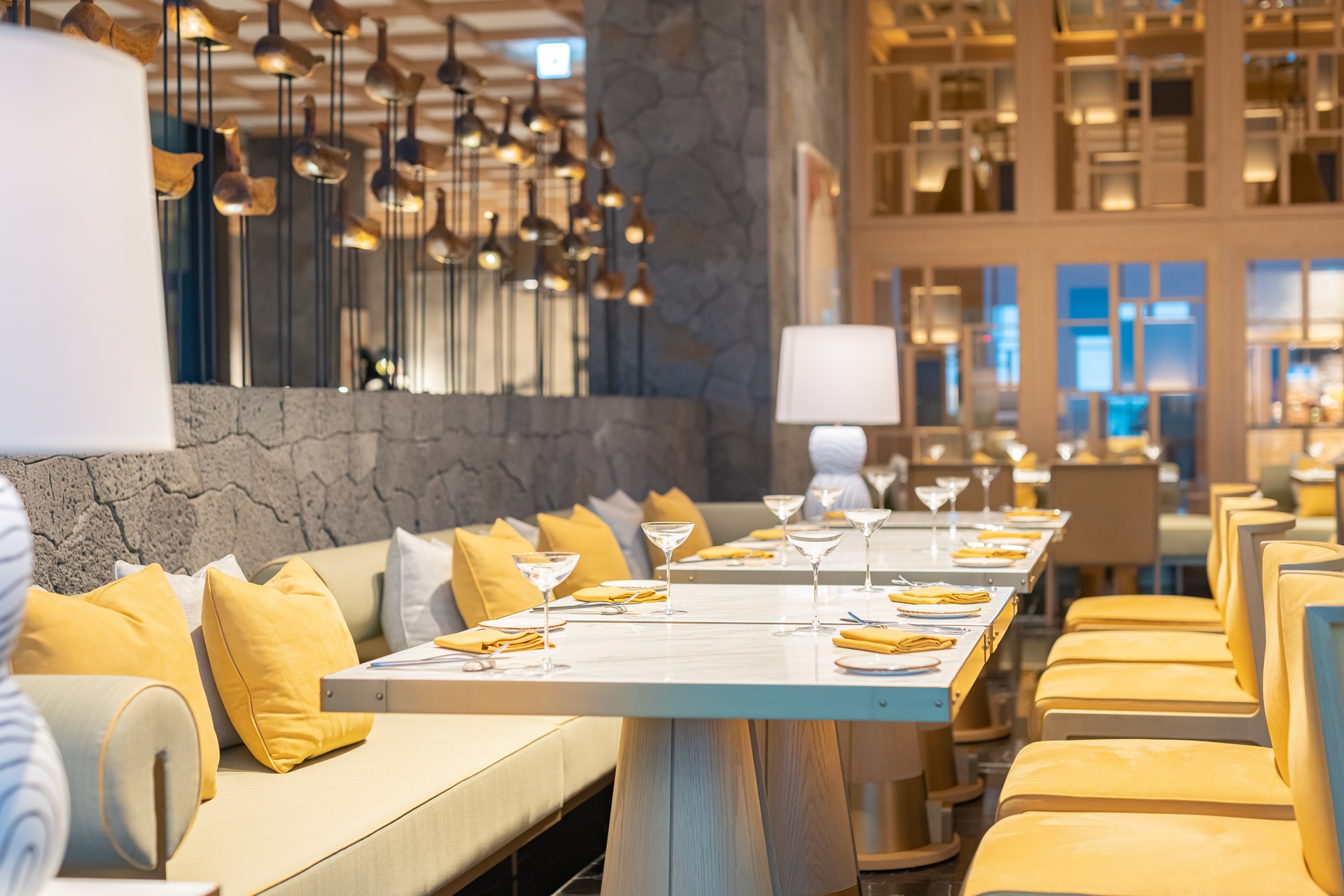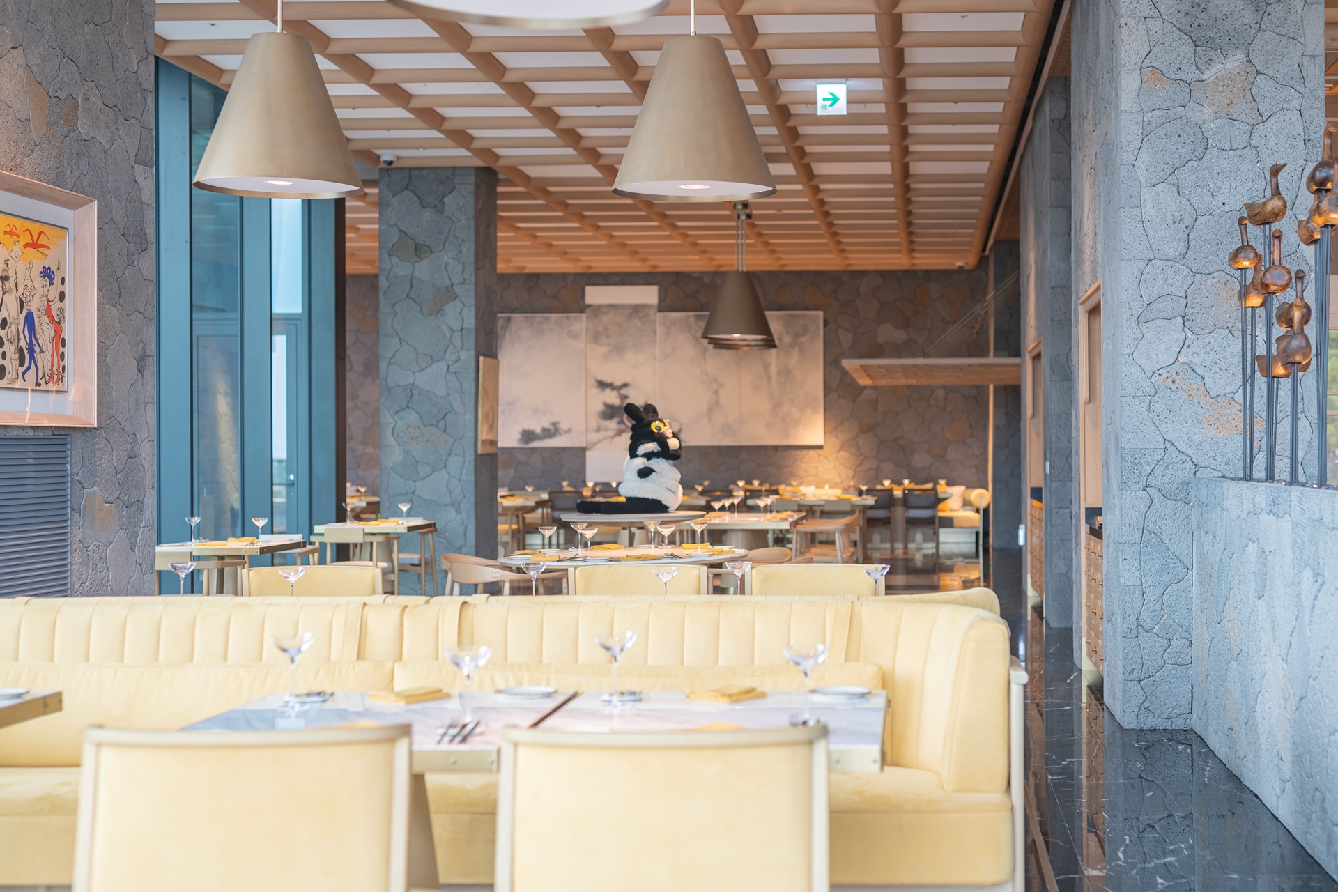 멋진 그림과 함께 레스토랑의 인테리어도 제주의 색이 가득 들어간 노랑, 하양, 회색, 검정으로 표현되고 있습니다. 호텔 디자이너 빌 벤슬리가 호텔을 디자인하며 제주의 색을 찾았는데 유채꽃의 노랑, 벚꽃의 하양, 돌담의 회색, 현무암의 검정을 표현하고 있는 것 같습니다.