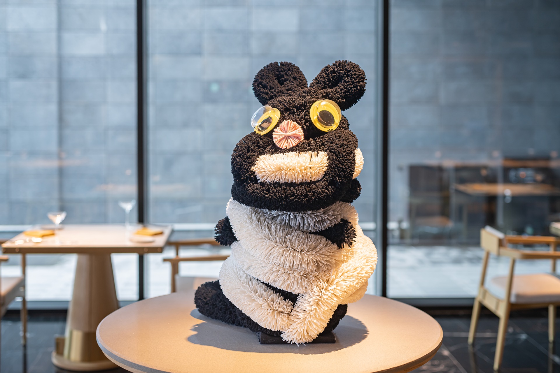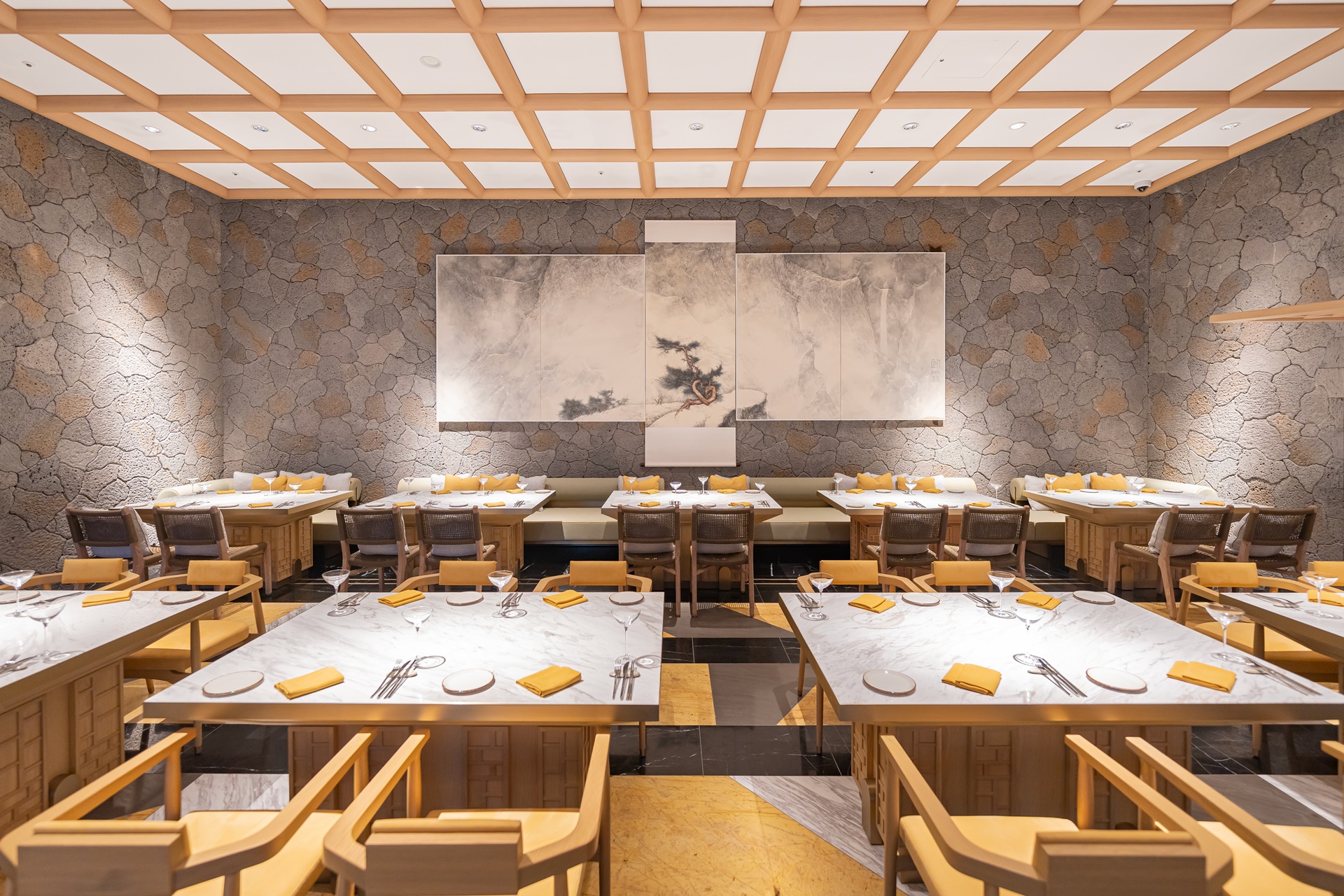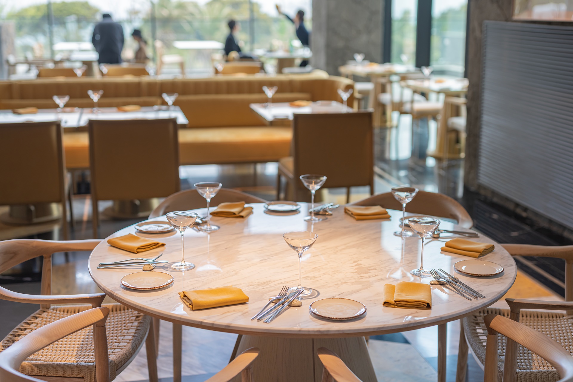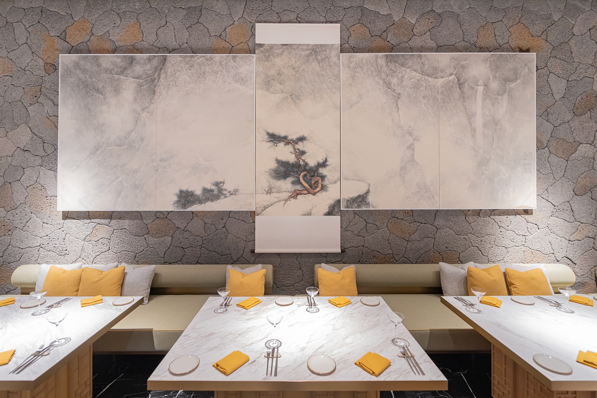 멋진 그림과 함께 레스토랑의 인테리어도 제주의 색이 가득 들어간 노랑, 하양, 회색, 검정으로 표현되고 있습니다. 호텔 디자이너 빌 벤슬리가 호텔을 디자인하며 제주의 색을 찾았는데 유채꽃의 노랑, 벚꽃의 하양, 돌담의 회색, 현무암의 검정을 표현하고 있는 것 같습니다.