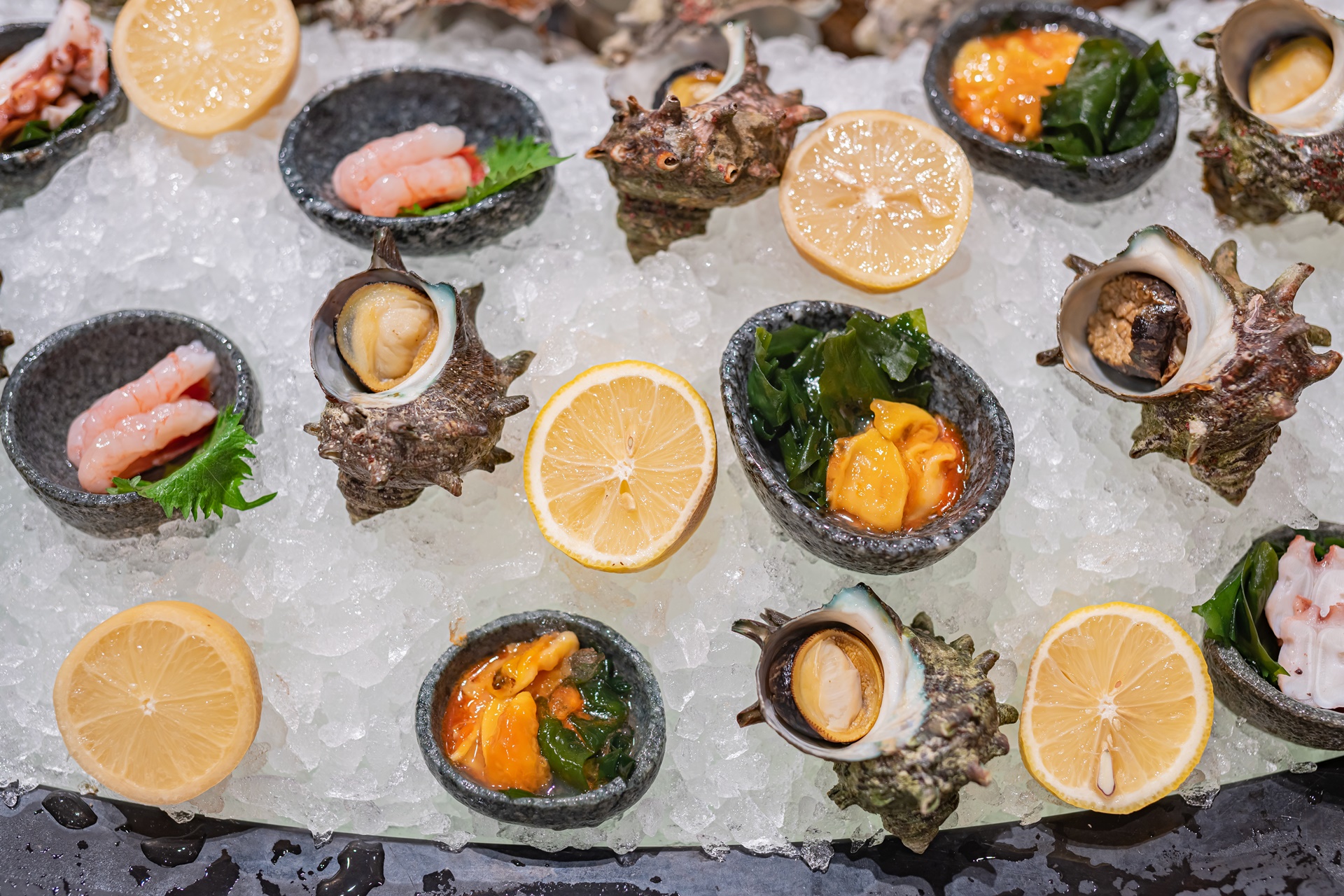 제주의 해산물이 가득, 소라, 새우, 문어, 멍게가 이쁘게 놓여 있습니다.