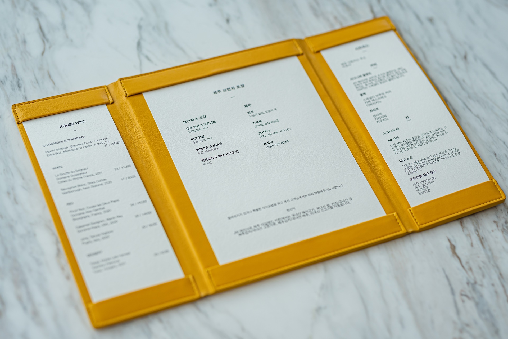 노란 조식 메뉴 판 저희는 본보이 포인트 숙박이라 무제한 샴페인과 최고급 캐비어은 제공되지 않았고 브런치 8가지 메뉴중에서 고를 수 있는 메뉴가 2가지로 한정되어 있었습니다.