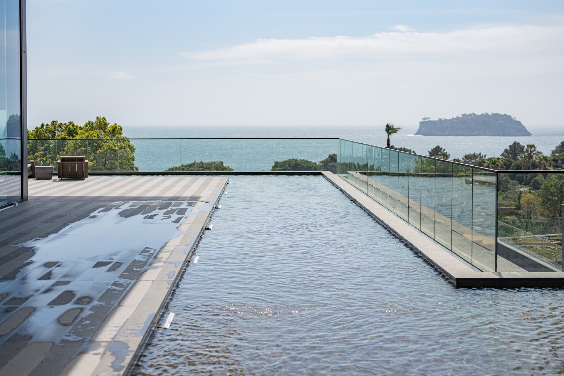 아직 정비중이지만 라운지 앞에는 물이 흐르고 있고 멀리 푸른 제주의 바다와 범섬이 보입니다.