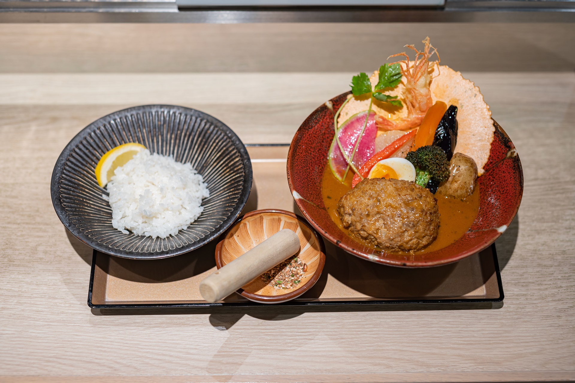 향신료를 갈아서 밥에 뿌리고 스프카레와 함께 먹습니다.