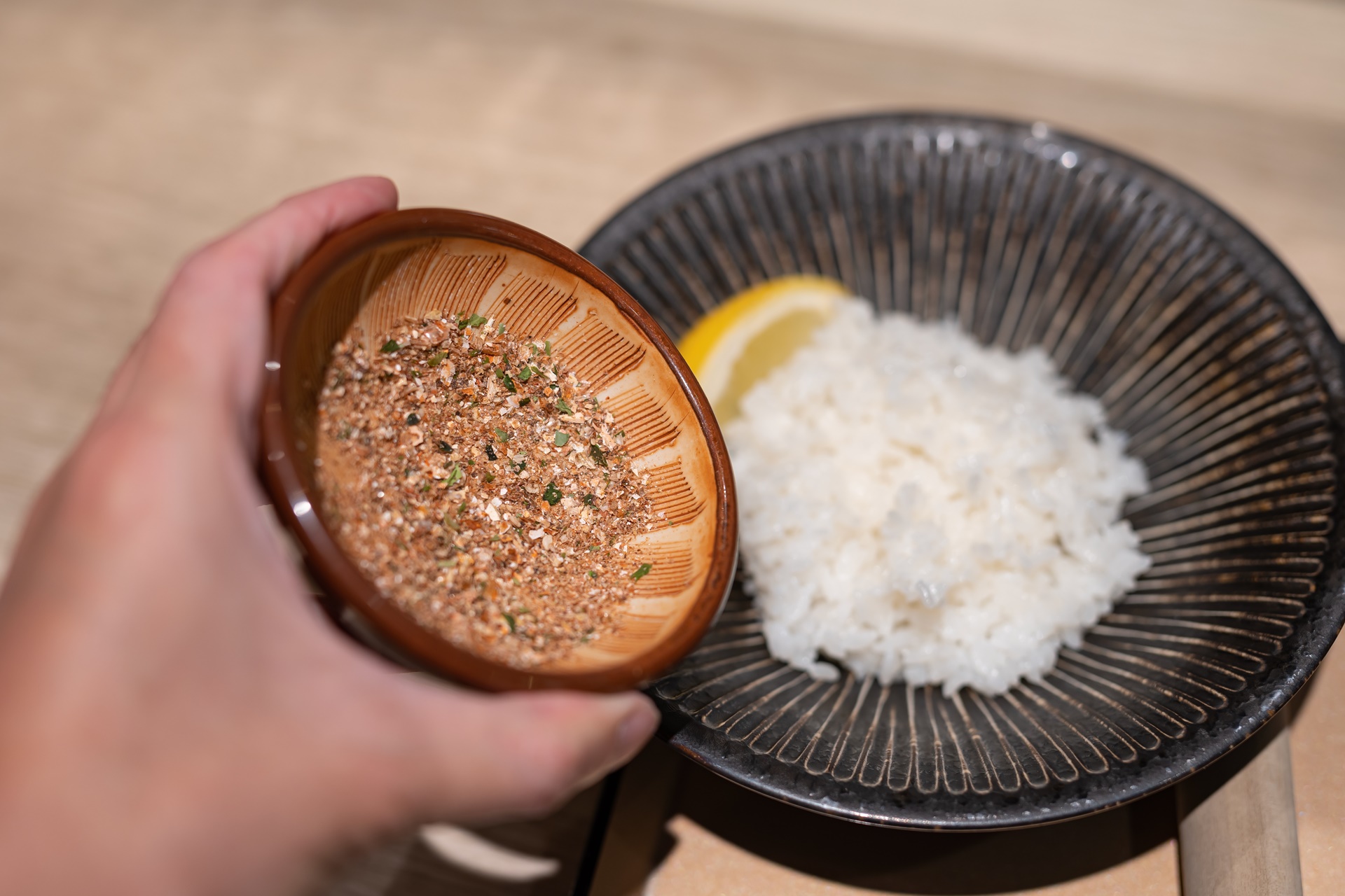 향신료를 갈아서 밥에 뿌리고 스프카레와 함께 먹습니다.