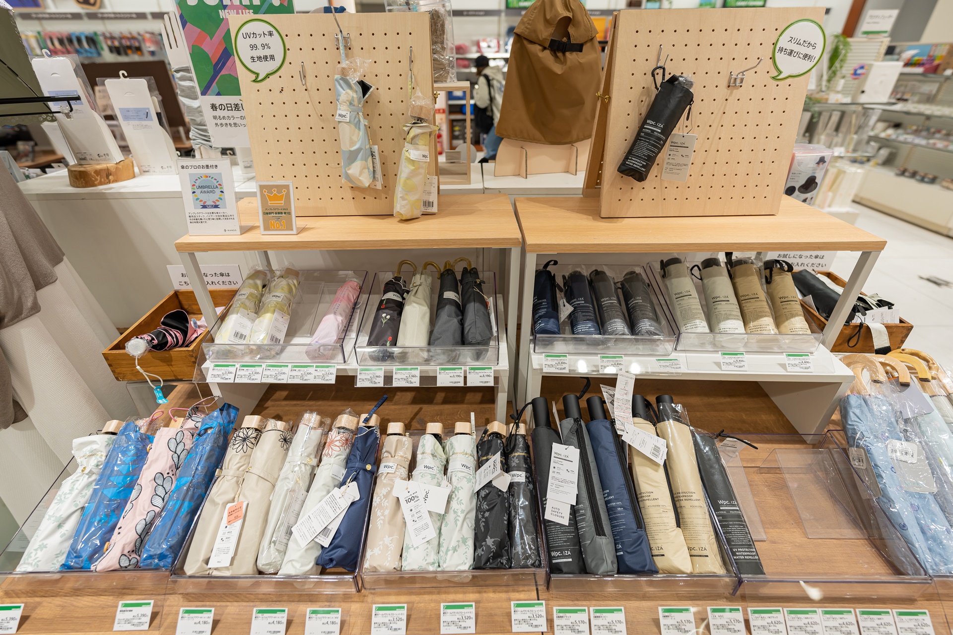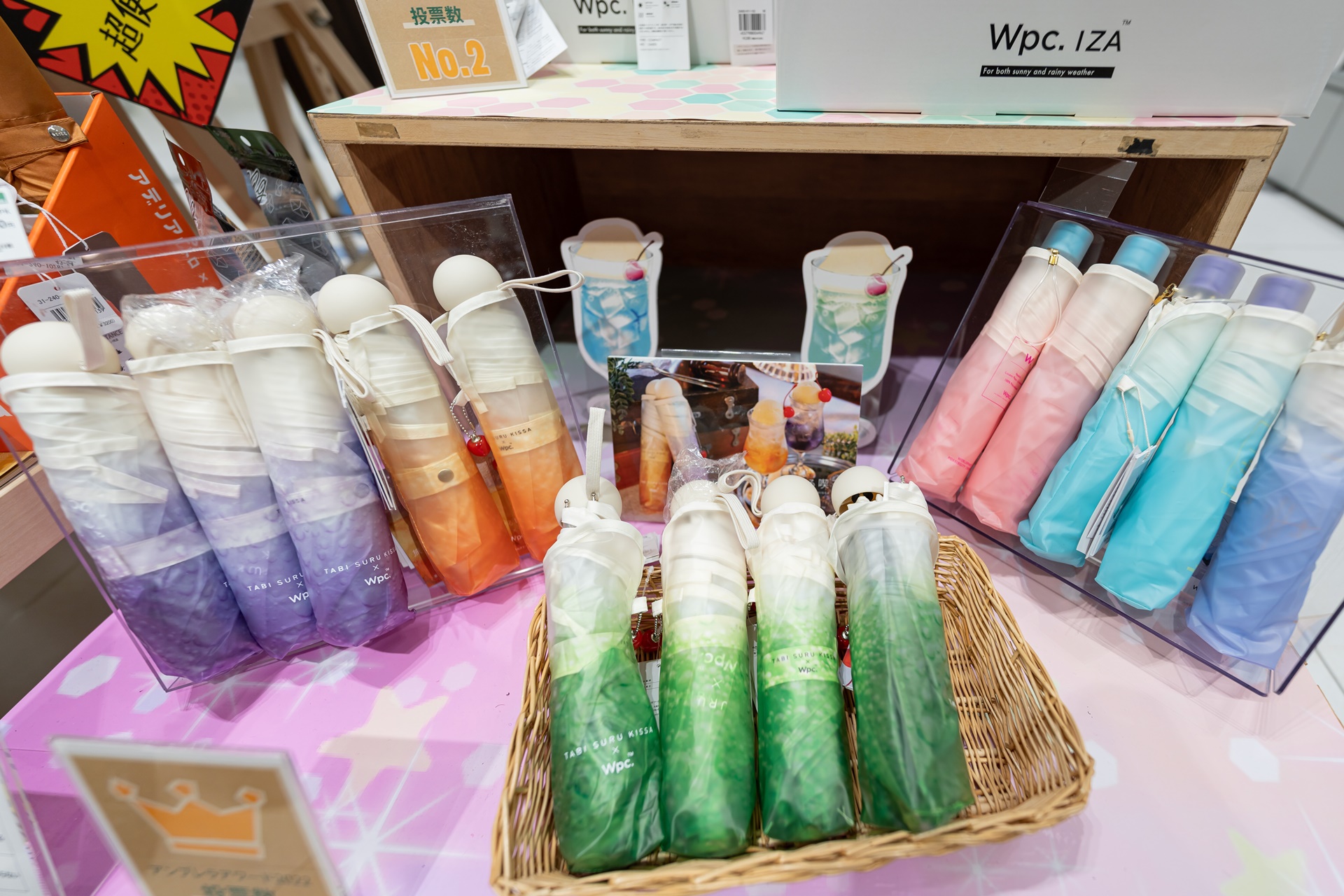 우산 종류가 다양하고 탄산 거품같은 디자인의 우산도 보입니다.