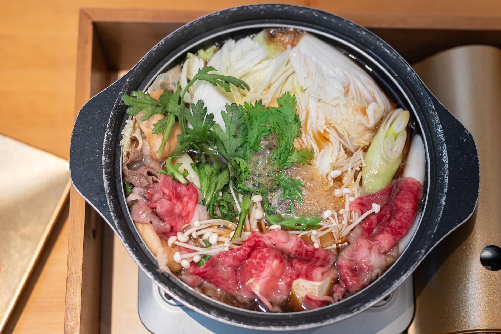 스키야키는 생 계란에 찍어 먹으면 더욱 맛있습니다.