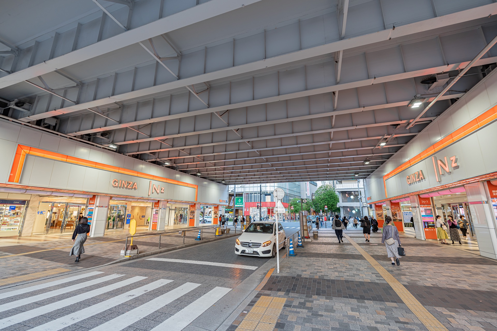 도쿄 수도고속도로 아래에서 긴자 인즈 몰 같은 많은 가게들이 모여 있습니다.