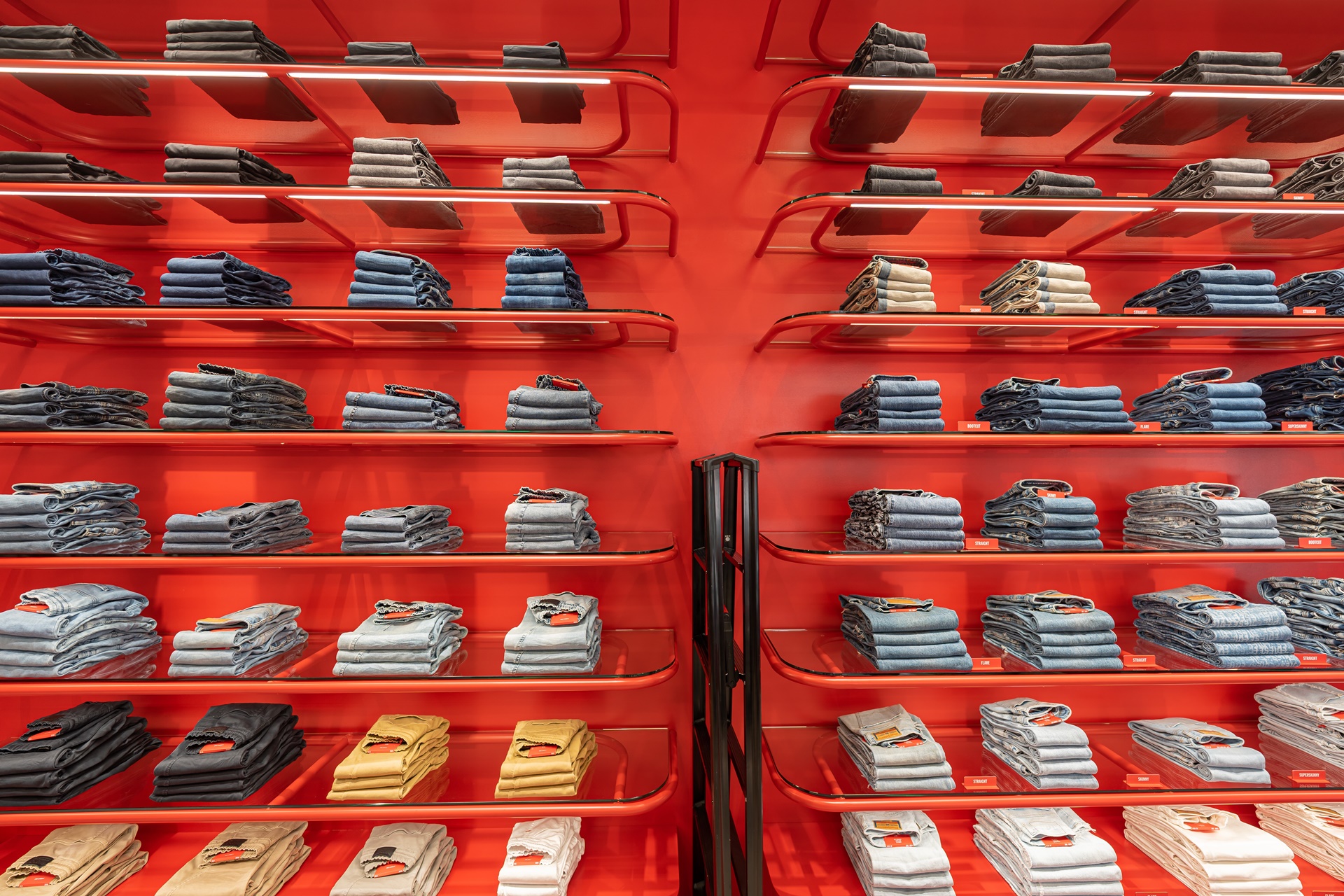브랜드의 아이콘인 붉은 로고를 연상하게 하는 빨강과 흰색의 벽 넓은 창 밖으로 들어오는 햇살이 밝은 공간을 만들어 냅니다.