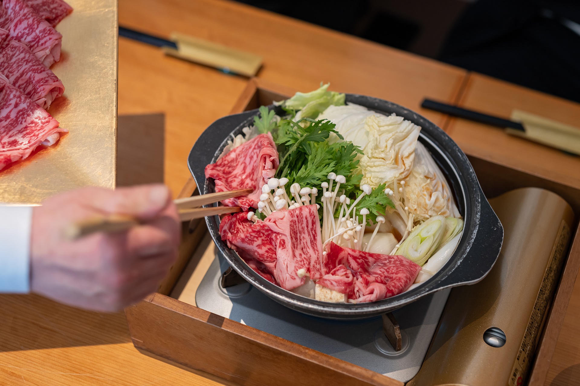 최고급 소고기 스키야키가 5,000엔(세금포함)이며