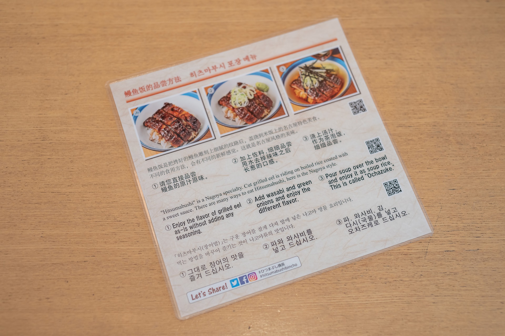 히쓰마부시는 장어구이를 잘게 다져 밥 위에 올린 나고야 명물 요리로 먹는 방법이 있는데 이 설명도 한글로 잘 나와 있어 좋았습니다.