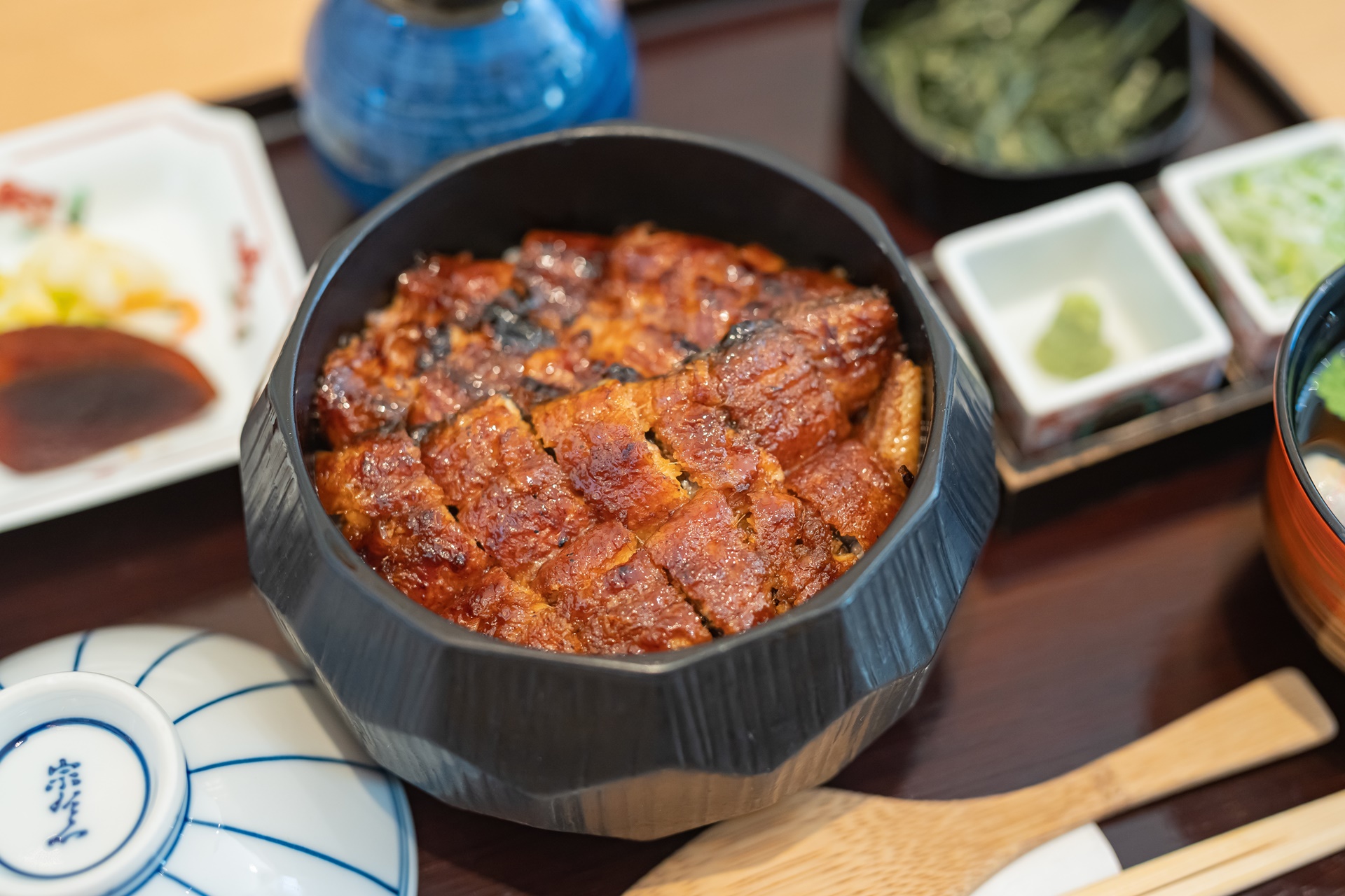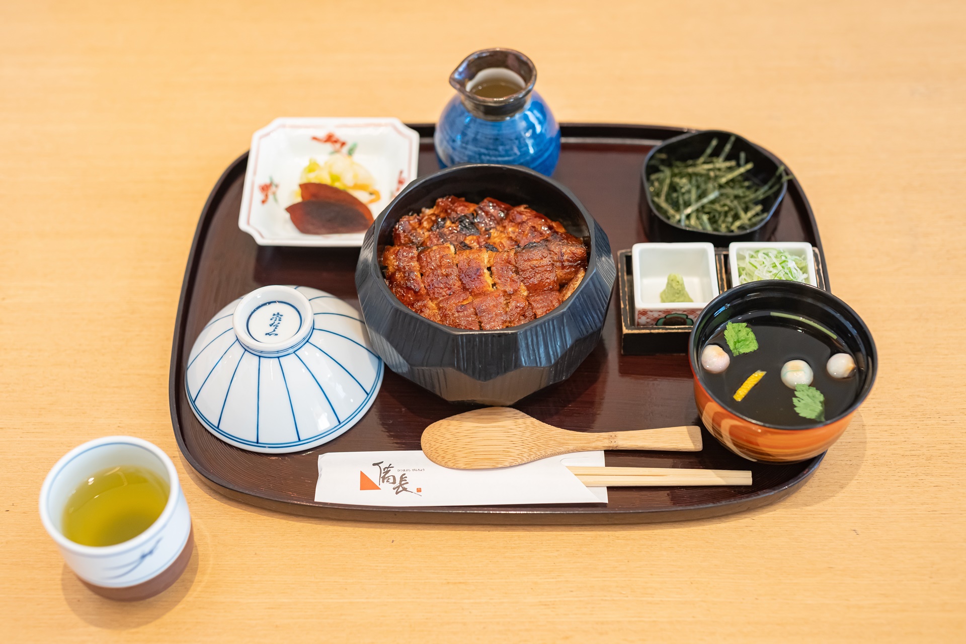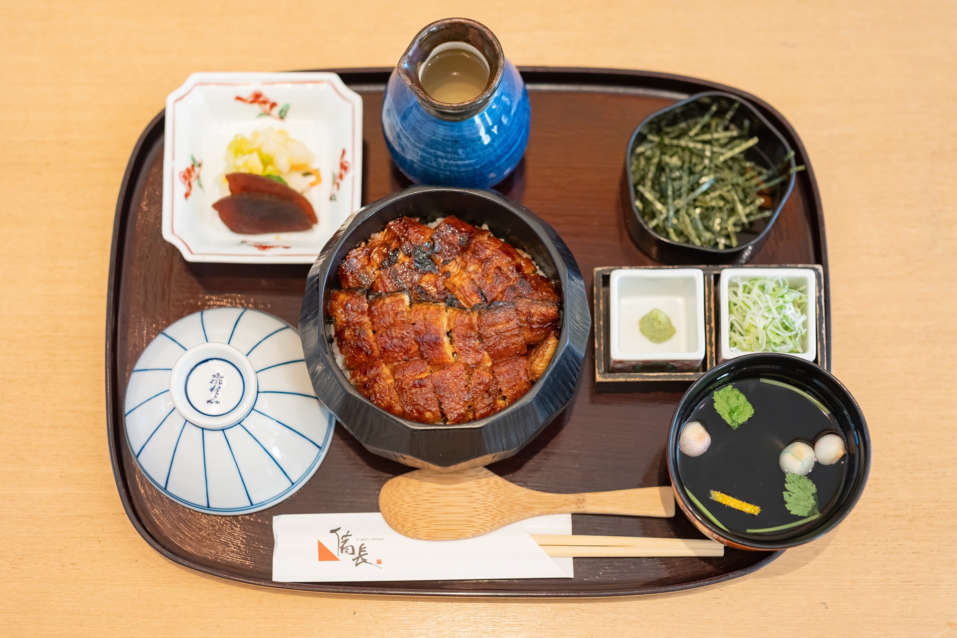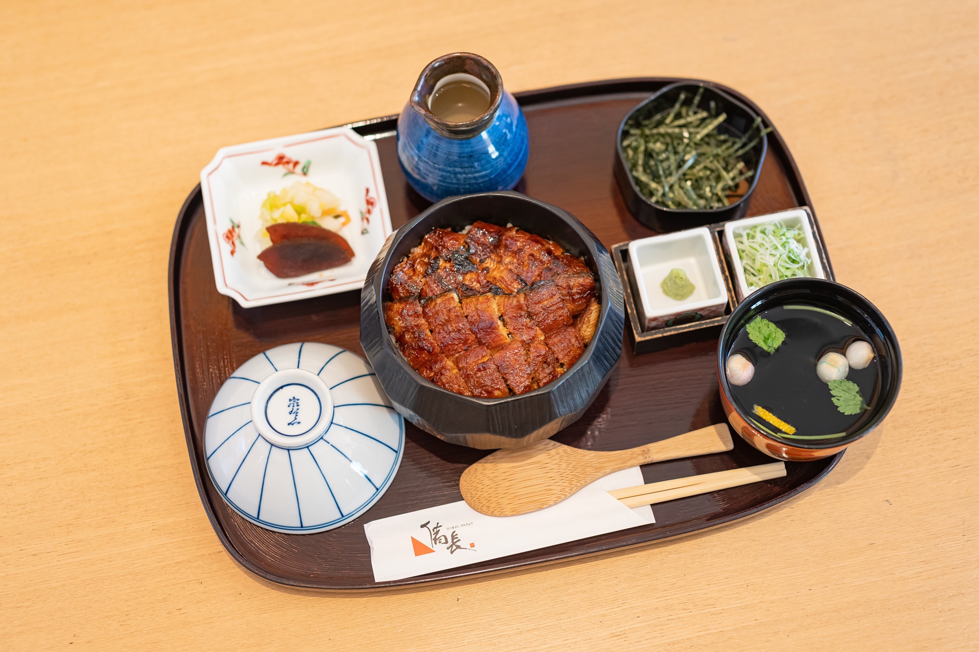 그아래 젓가락과 밥을 섞는 주걱이 있으며 그 옆에 장어로 육수를 낸 맑은 장국