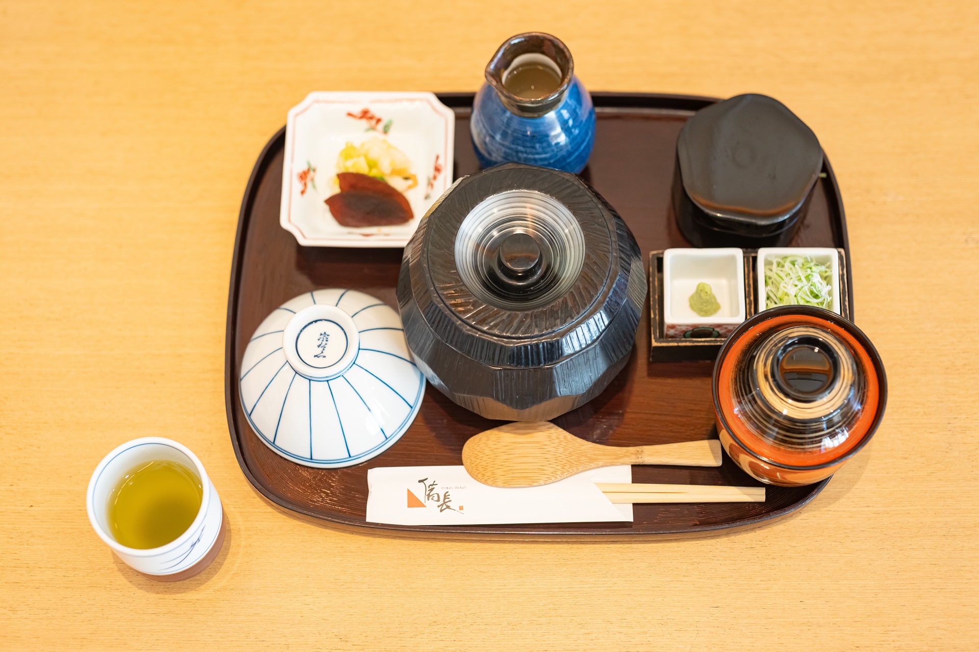 위에는 와사비와 파, 김가루 통 오른쪽 옆으로 오차즈케를 위한 육수 그 옆에 츠케모노(반찬)이 있습니다.