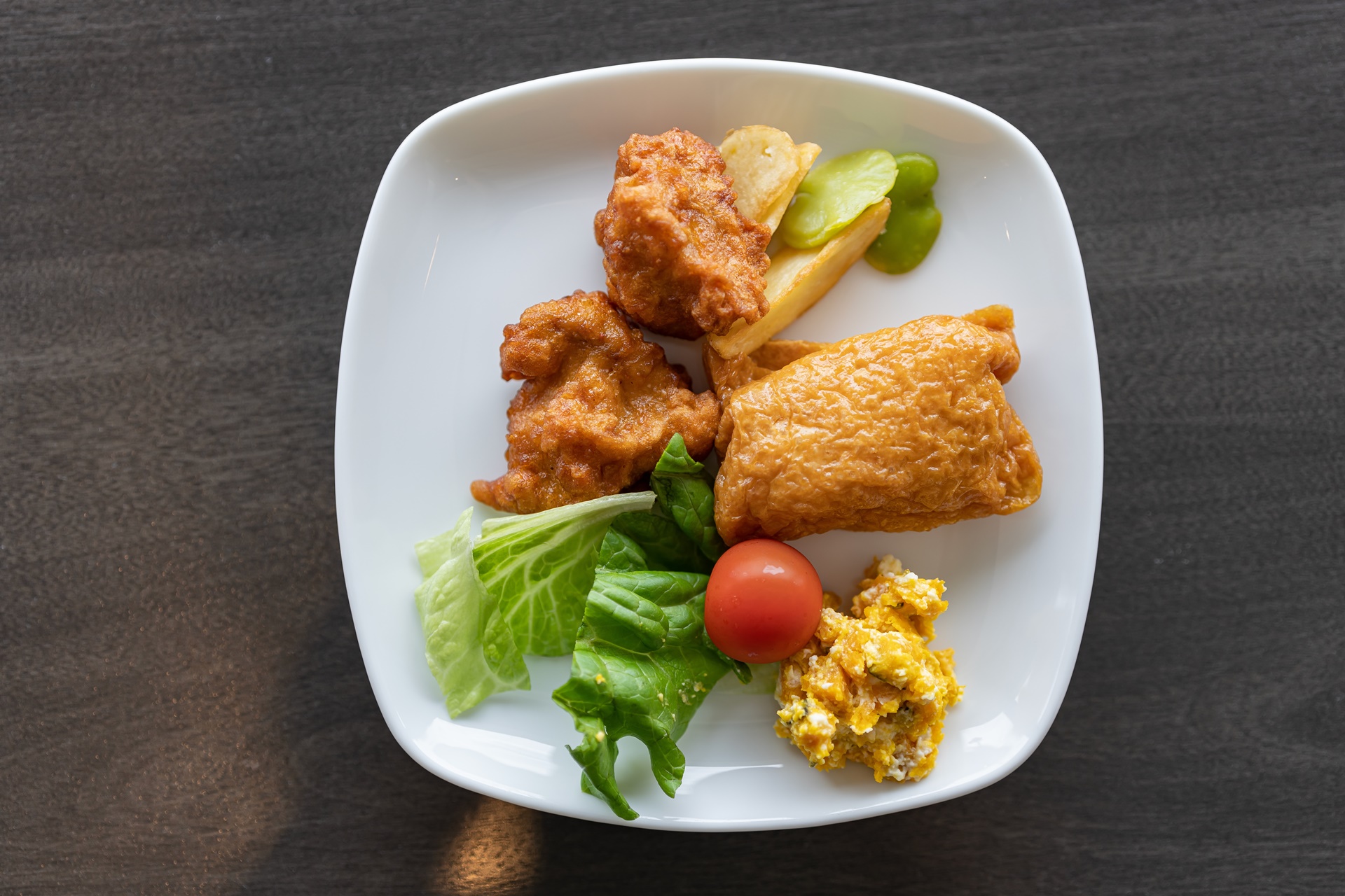 유부초밥, 닭튀김, 샐러드 등을 먹고