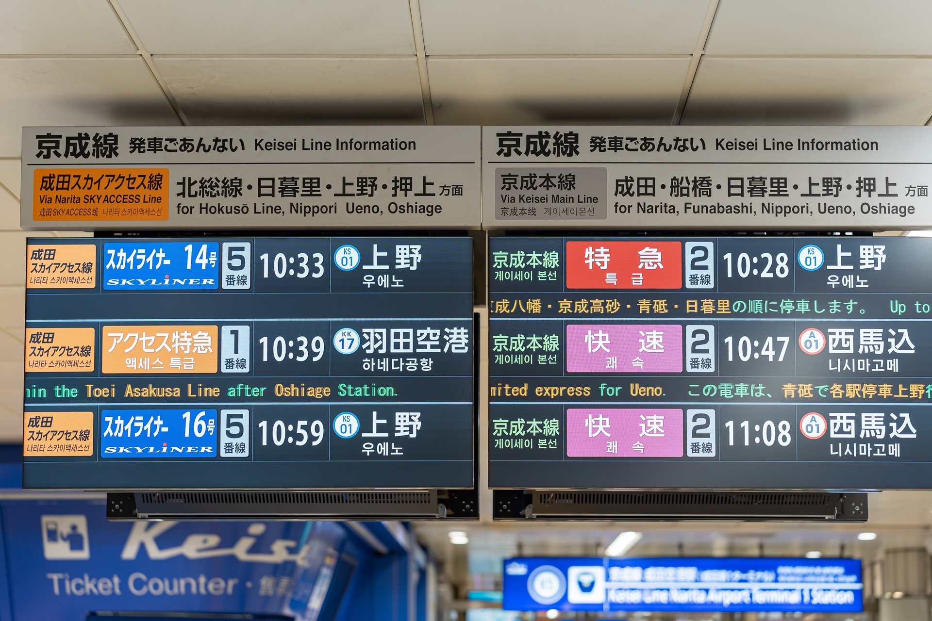 게이세이선에는 스카이라이너 라는 특급 열차가 있고 JR에는 나리타 익스프레스라는 특급 열차가 있으며 각각 도쿄까지의 이동시간은 45~60분 정도 걸립니다.