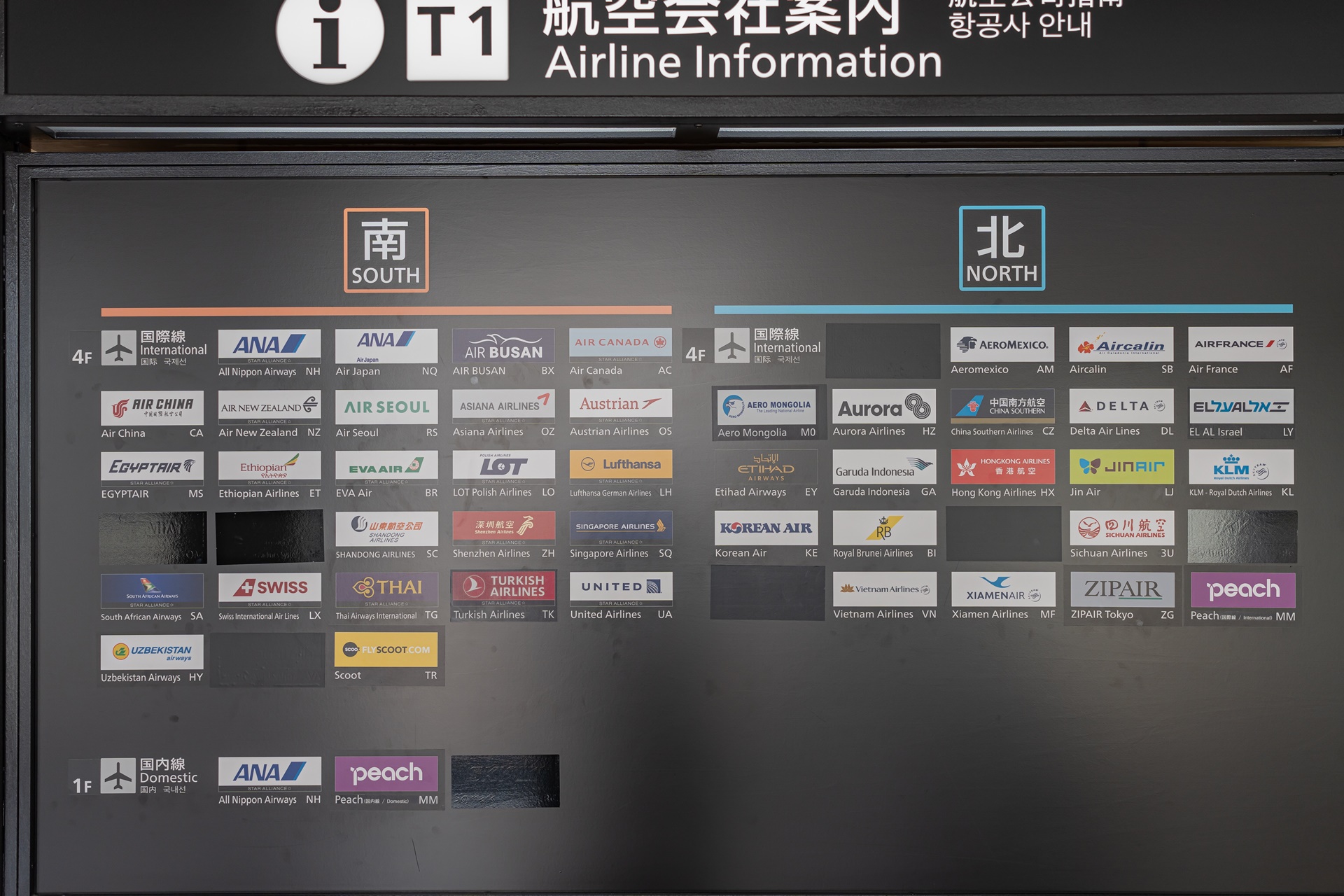 나리타 공항 1터미널은 남과 북으로 나뉘며 남쪽에는 아시아나를 비롯 ANA 등 스타얼라이언스의 항공사들이 모여 있고 에어서울도 이곳에 있습니다. 북쪽에는 대한항공, 진에어가 있습니다. 제2 터미널은 에어프레미아, 티웨이 항공이 제3 터미널에는 제주항공이 있습니다.