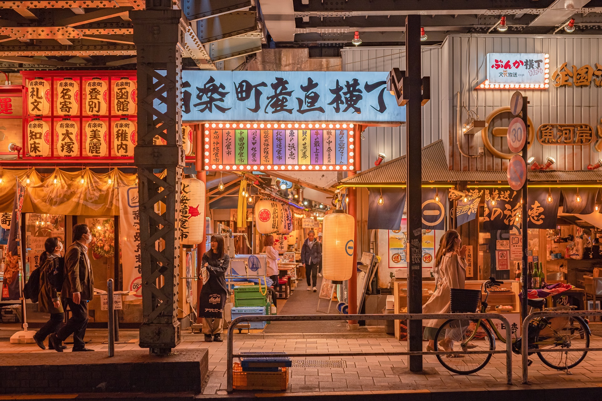 유라쿠쵸와 신바시 사이의 철길 아래의 포장마차 거리 같은 느낌으로 많은 가게들이 모여 있습니다.