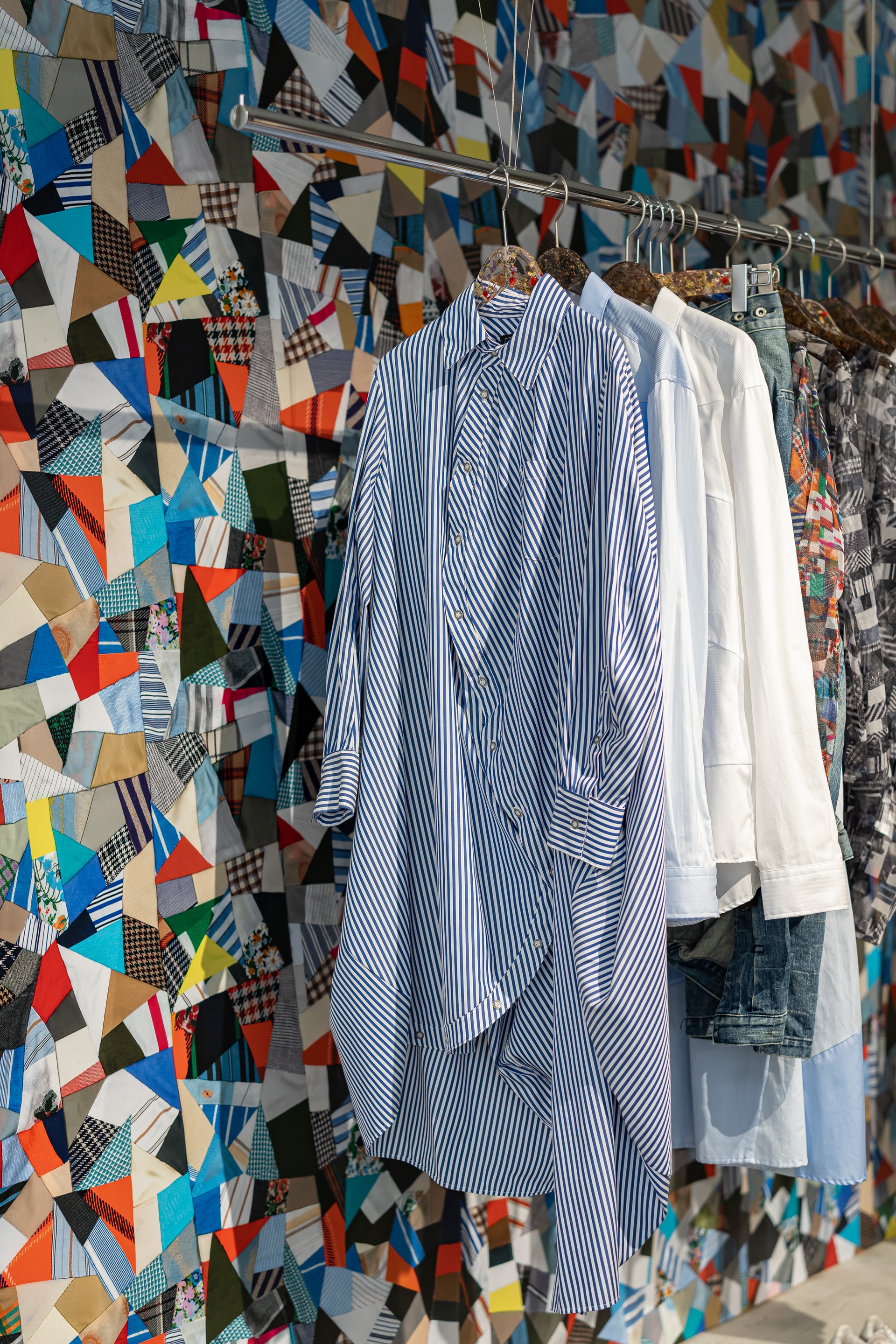 여러 천조각을 이어붙여 만든 패치워크 디자인의 옷들