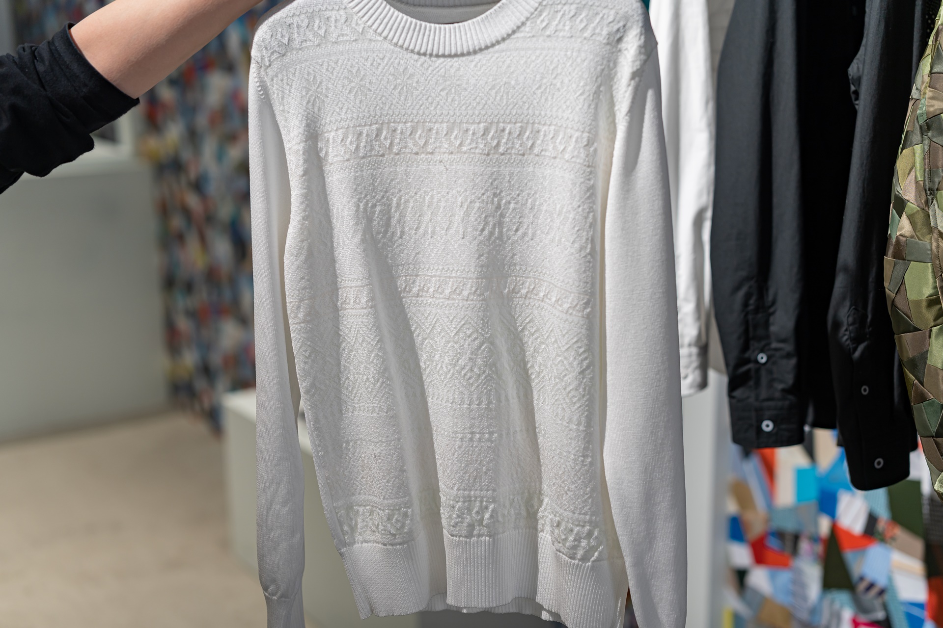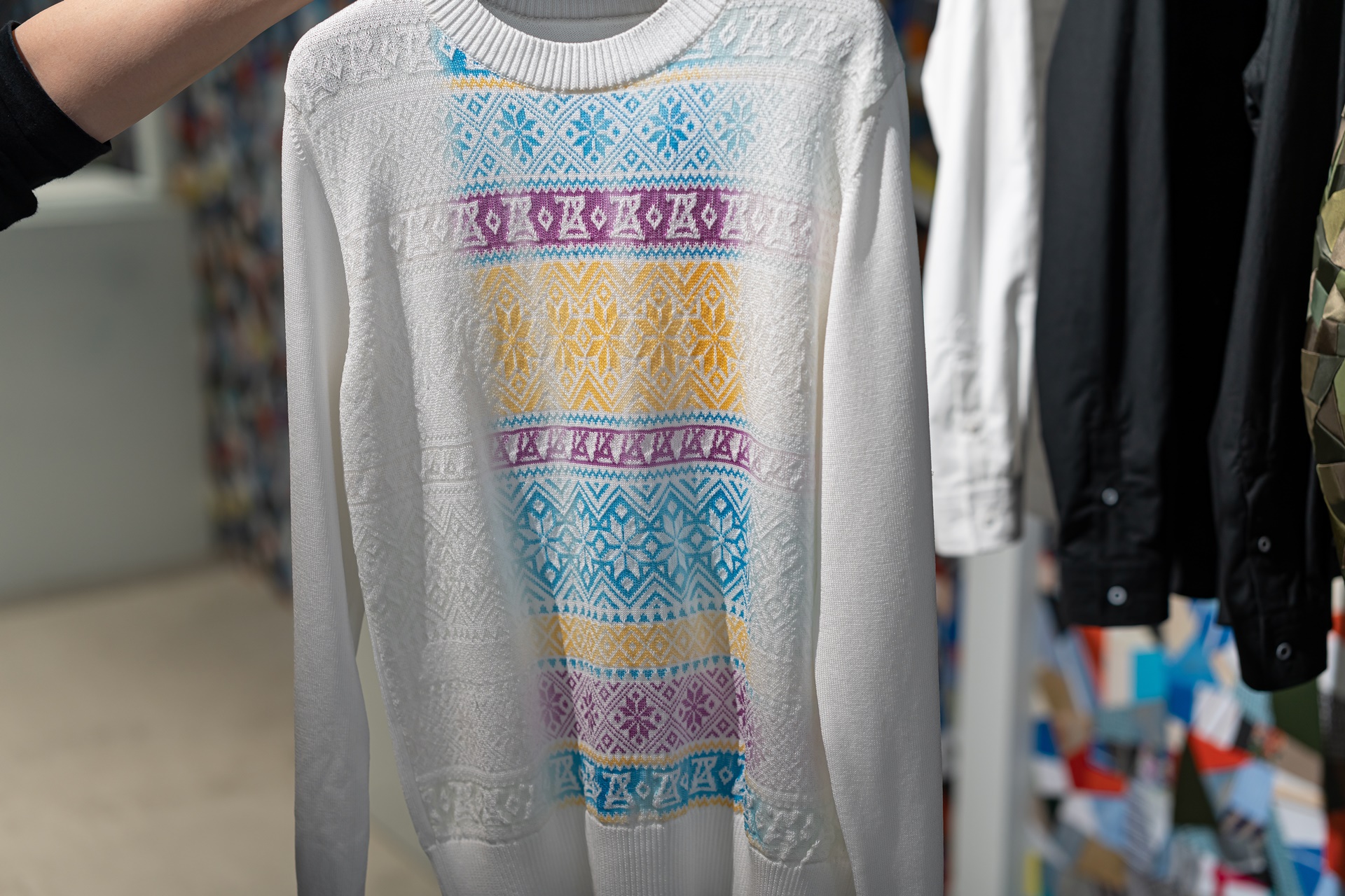 하얀 니트에 색색의 무늬가 생겨나고 있습니다.