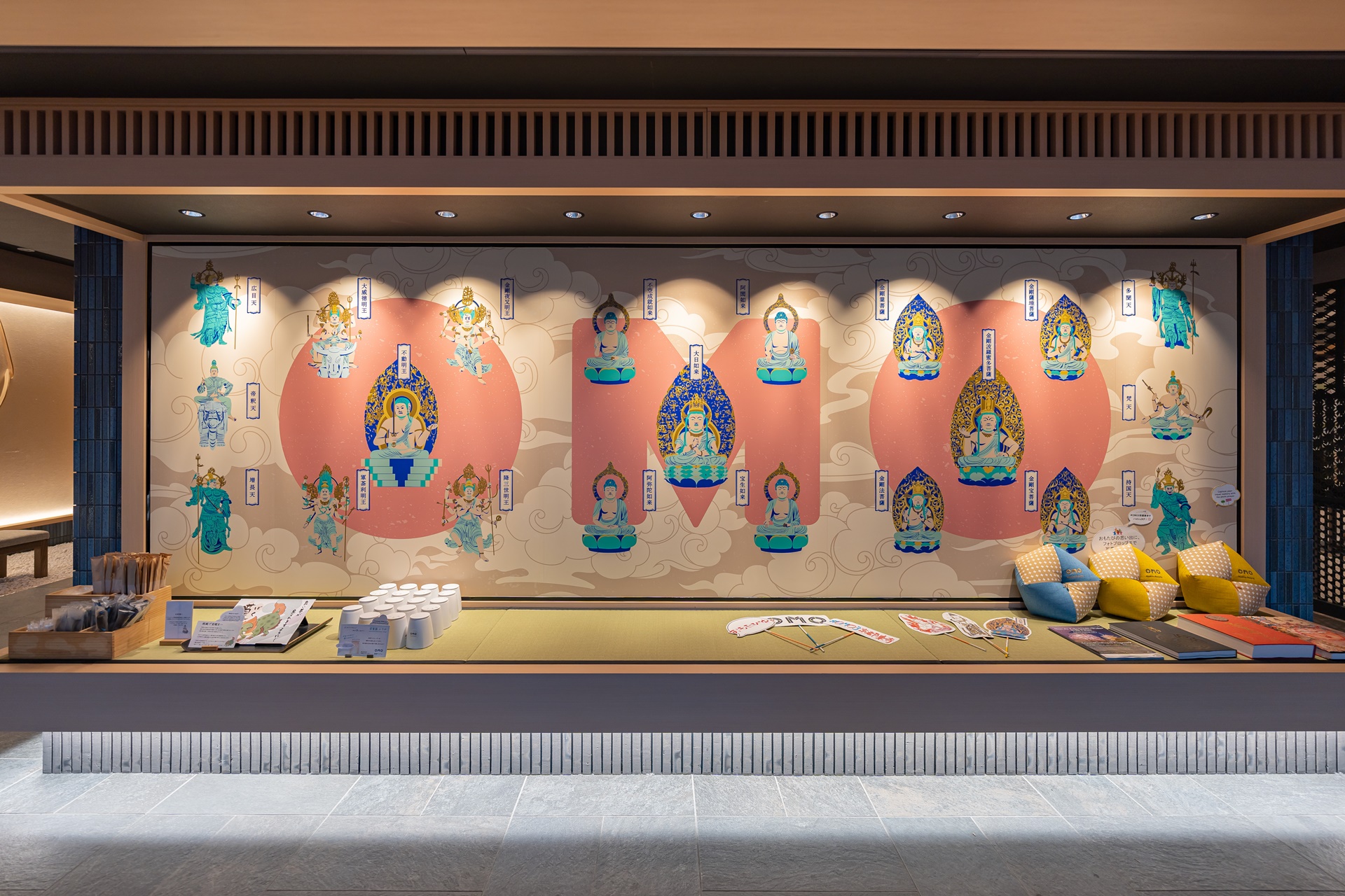 도지에 있는 만다라 21존 불상의 내용을 그대로 그려 놓은 오리지널 아트가 있으며 그 아래는 불교 경전, 연기가 나지 않는 향 디퓨저, 어메니티가 준비되어 있었습니다.