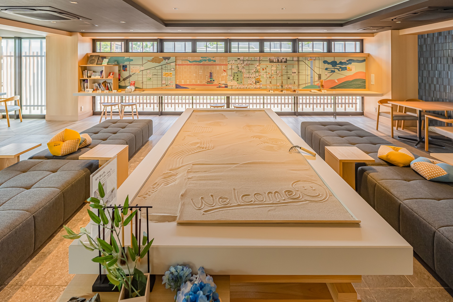 호텔 로비에는 모래 사경(경문을 베껴 쓰는 것) 이 준비되어 있었으며 붓으로 글씨를 서보거나 교토의 자갈 정원처럼 무늬를 만들어서 꾸며 보는 것이 가능 했습니다.