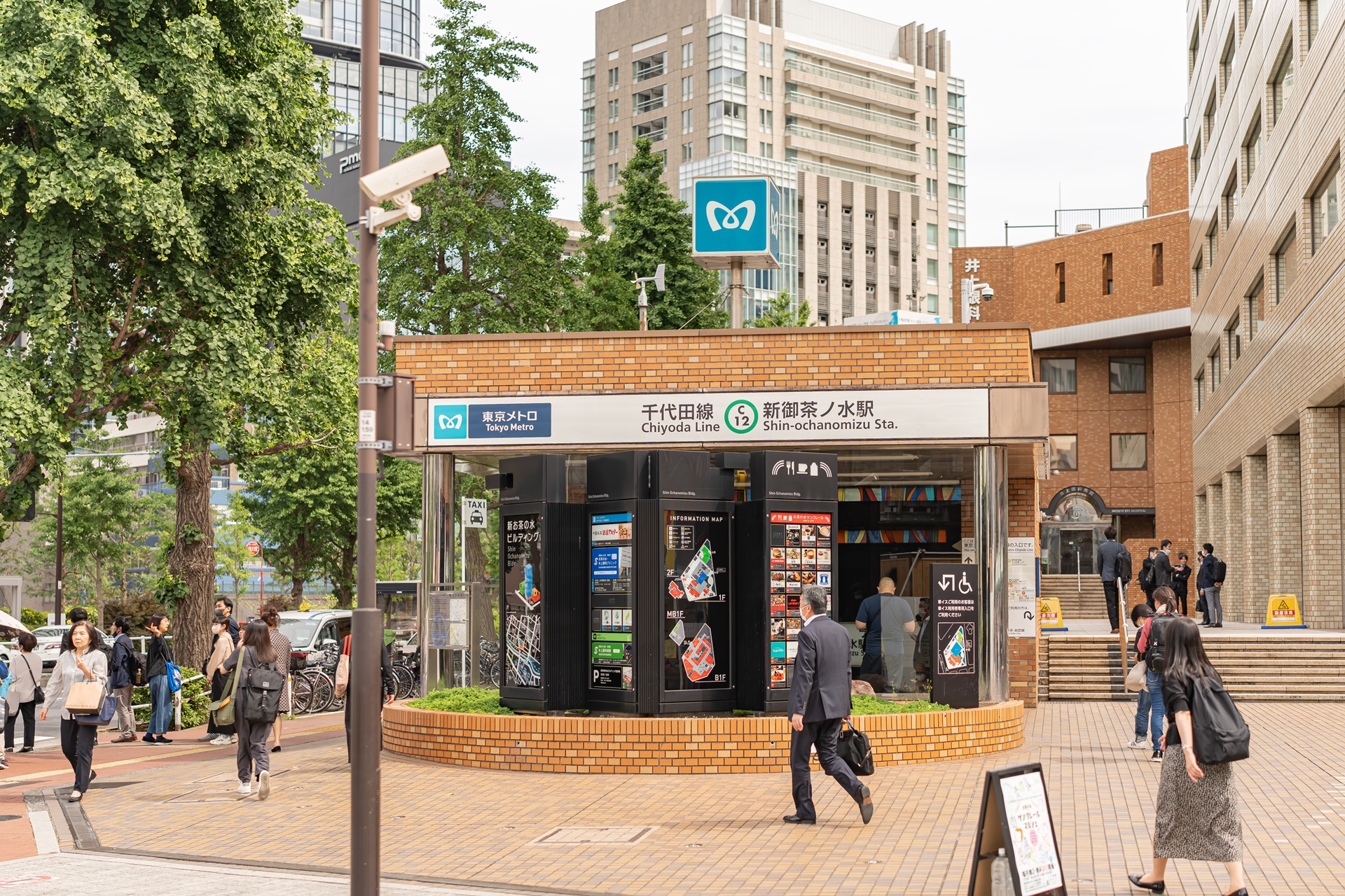 오차노미즈역은 JR 추오선(中央線), 쇼부선(総武線) 전차가 다니며 바로 옆에 도쿄 메트로의 신오차노미즈(新御茶ノ水) 역과 오차노미즈역이 있어 어느 역을 이용해도 히지리바시와 가깝습니다.