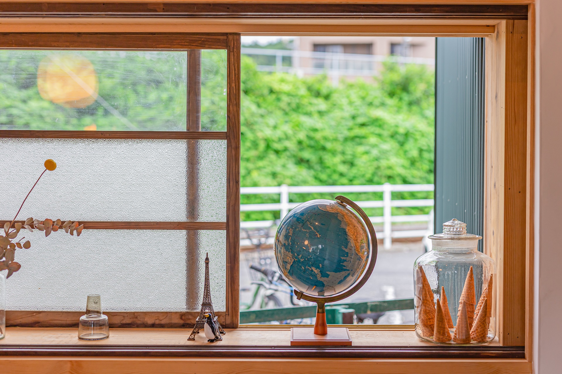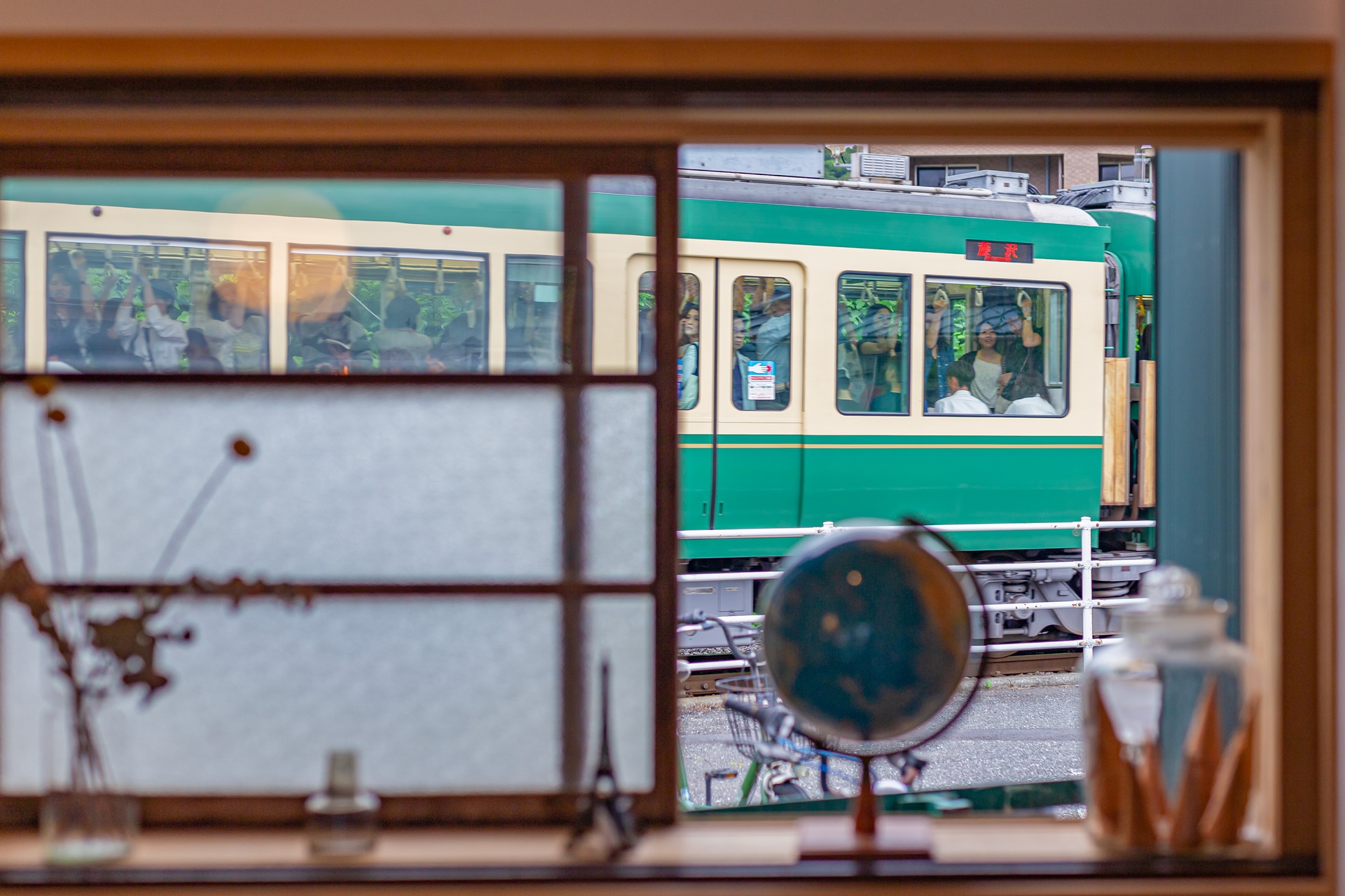 창문 너머로 에노시마와 가마쿠라를 지나가는 에노덴 전차가 보입니다.