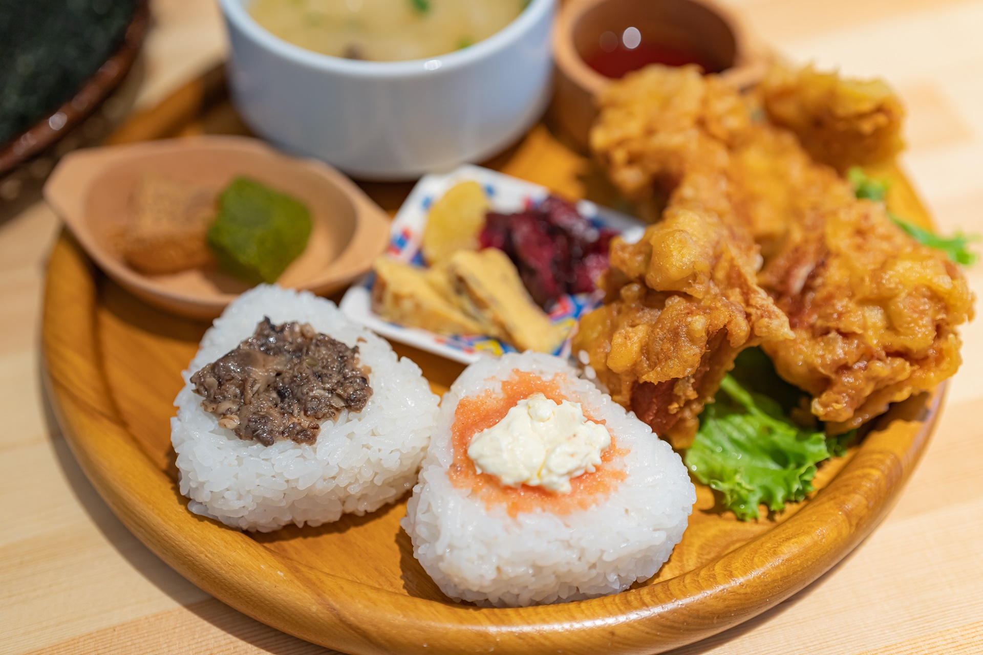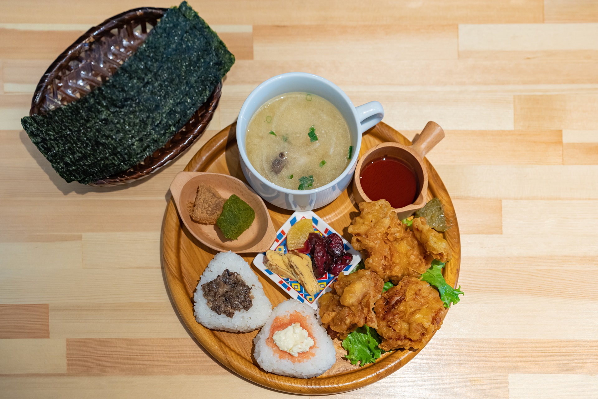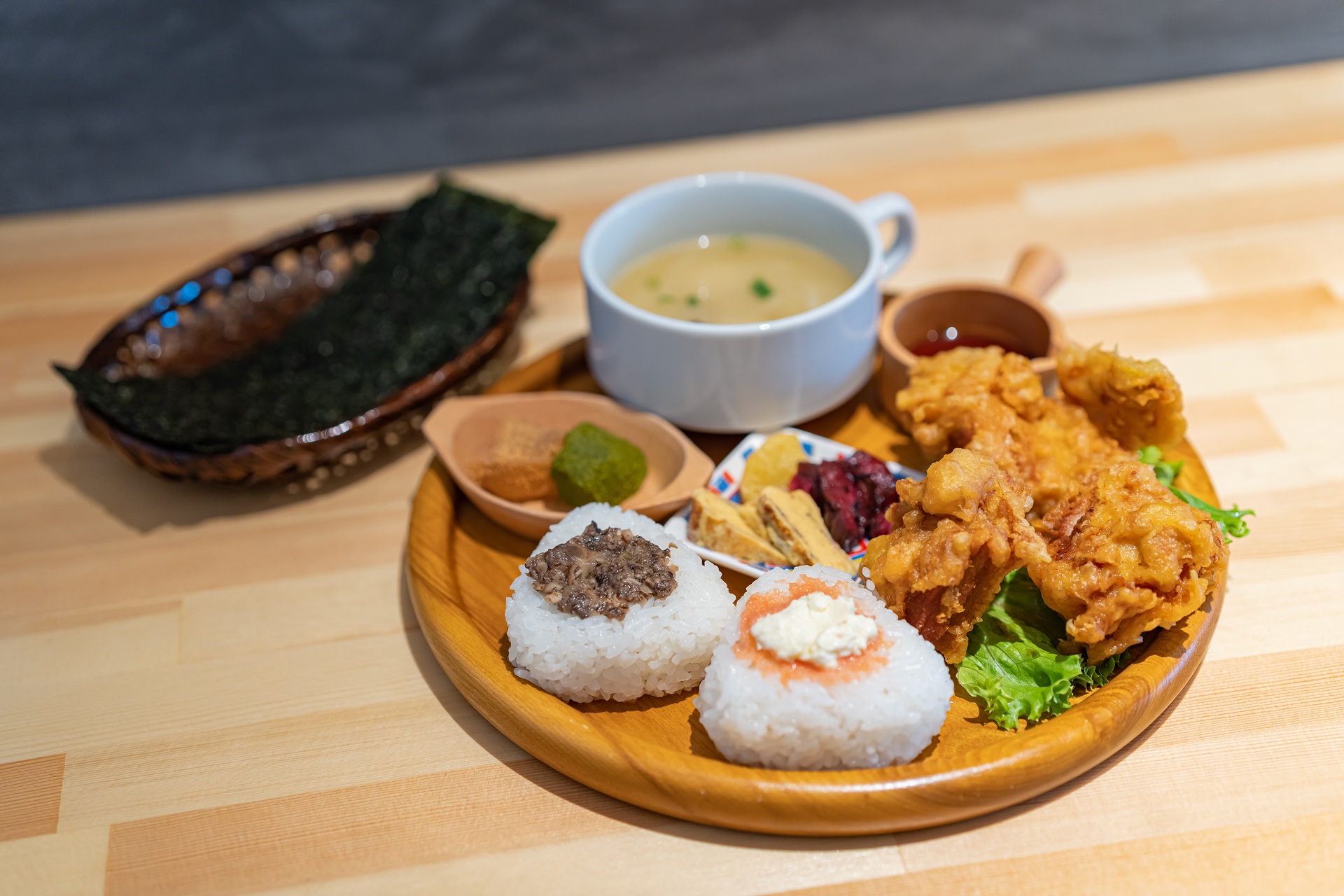삼각김밥 한 접시로 메뉴에서 선택할 수 있는 삼각 김밥 중 2종류와 유후인이 속해있는 오이타 현의 명물인 도리텐, 맑은 된장 국, 와라비모찌, 계란말이와 츠케모노가 한 접시에 담겨 나옵니다.