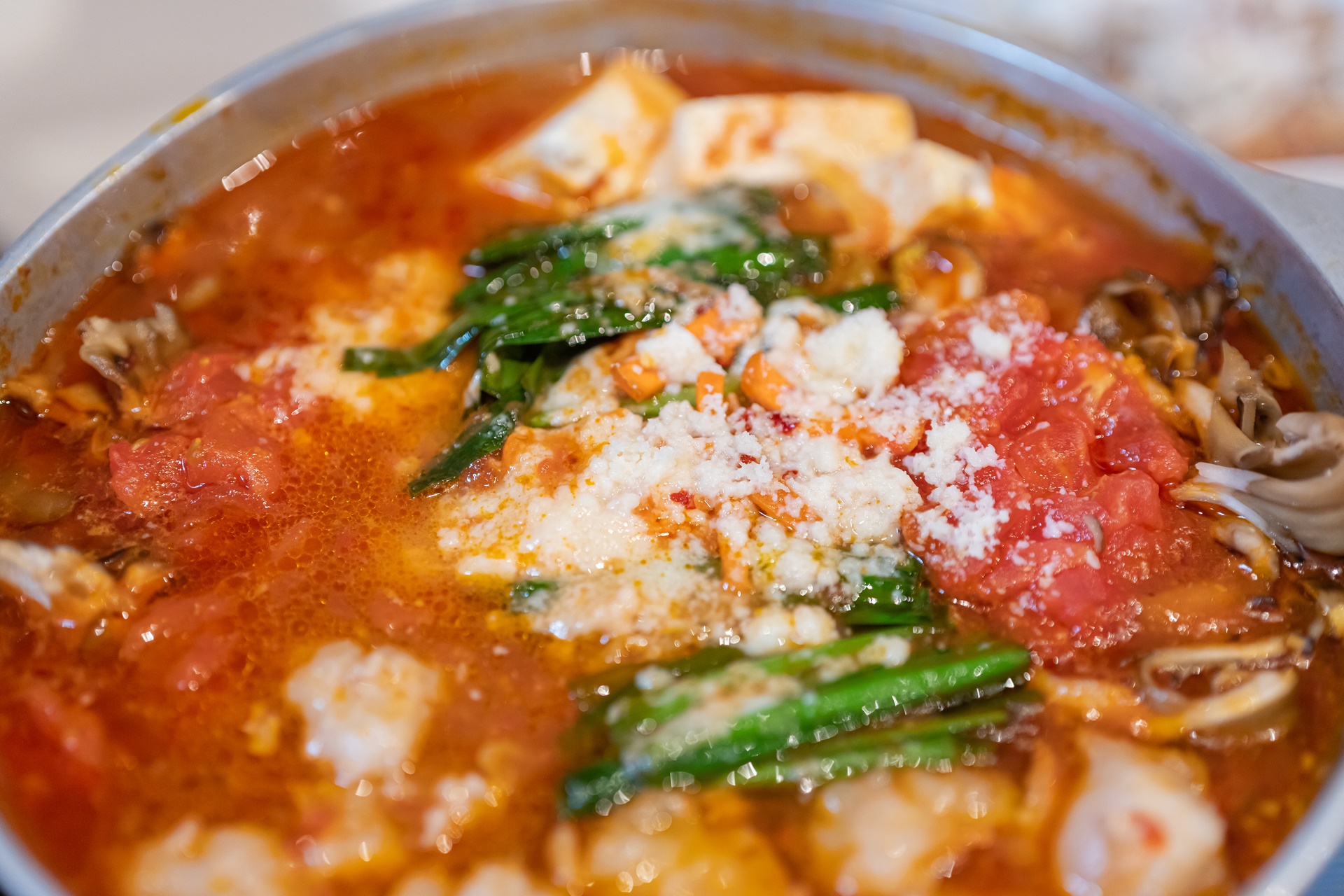 3명이서 2인 분을 주문하였고 야채육수에 토마토를 듬뿍넣어 느끼하지 않고 산뜻한 모츠나베입니다.