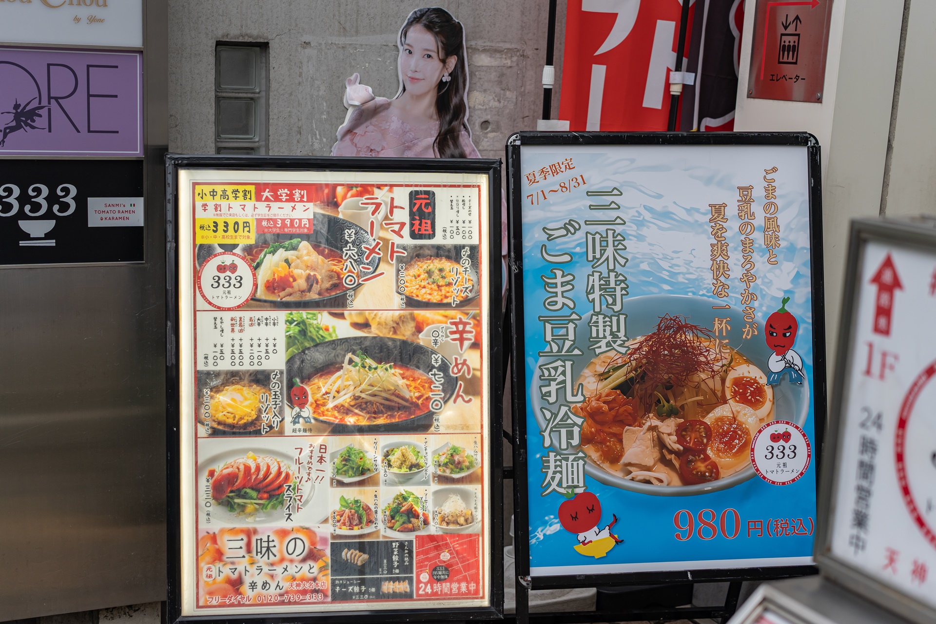 24시간 운영하며 토마토 라멘 이외에도 두유 라멘, 카라멘(매운 라멘) 등 메뉴가 다양하며 주로 야채 본연의 맛을 살린 메뉴가 많았습니다. 가게 앞 메뉴 뒤에 아이유가 웃고 있었습니다.