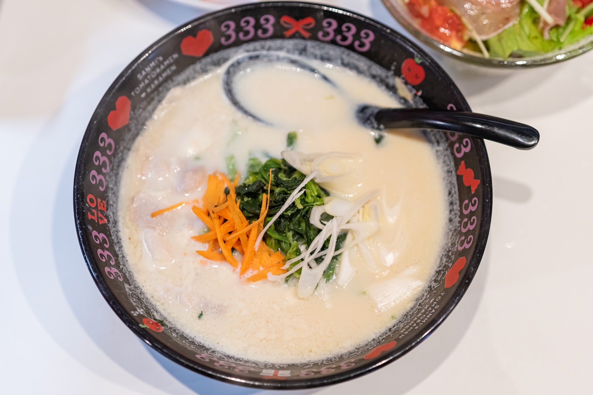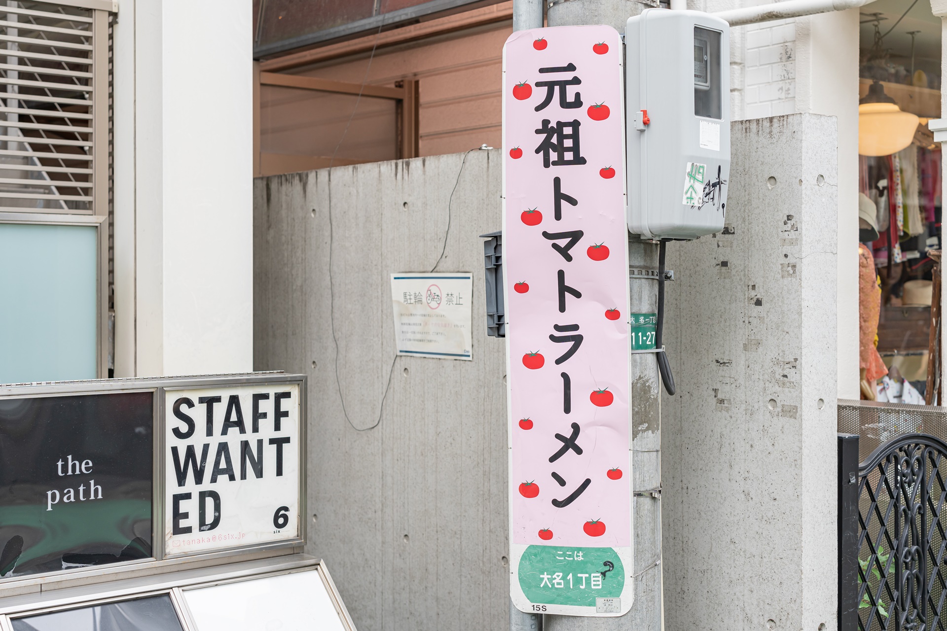 후쿠오카의 라멘은 돼지뼈를 삶은 돈코츠 라멘 가게가 많은데 이곳은 토마토와 야채를 이용한 산뜻한 라멘을 전문으로 하는 가게 입니다. 토마토 라멘도 후쿠오카가 원조이며 후쿠오카의 곳곳에 토마토 라멘 가게들이 많습니다. 이곳 다이묘점은 본점으로 2015년 부터 시작하였다고 합니다. 핑크색 간판에 귀여운 토마토 그림이 그려져 있는 간판을 보고 쉽게 찾을 수 있었습니다.