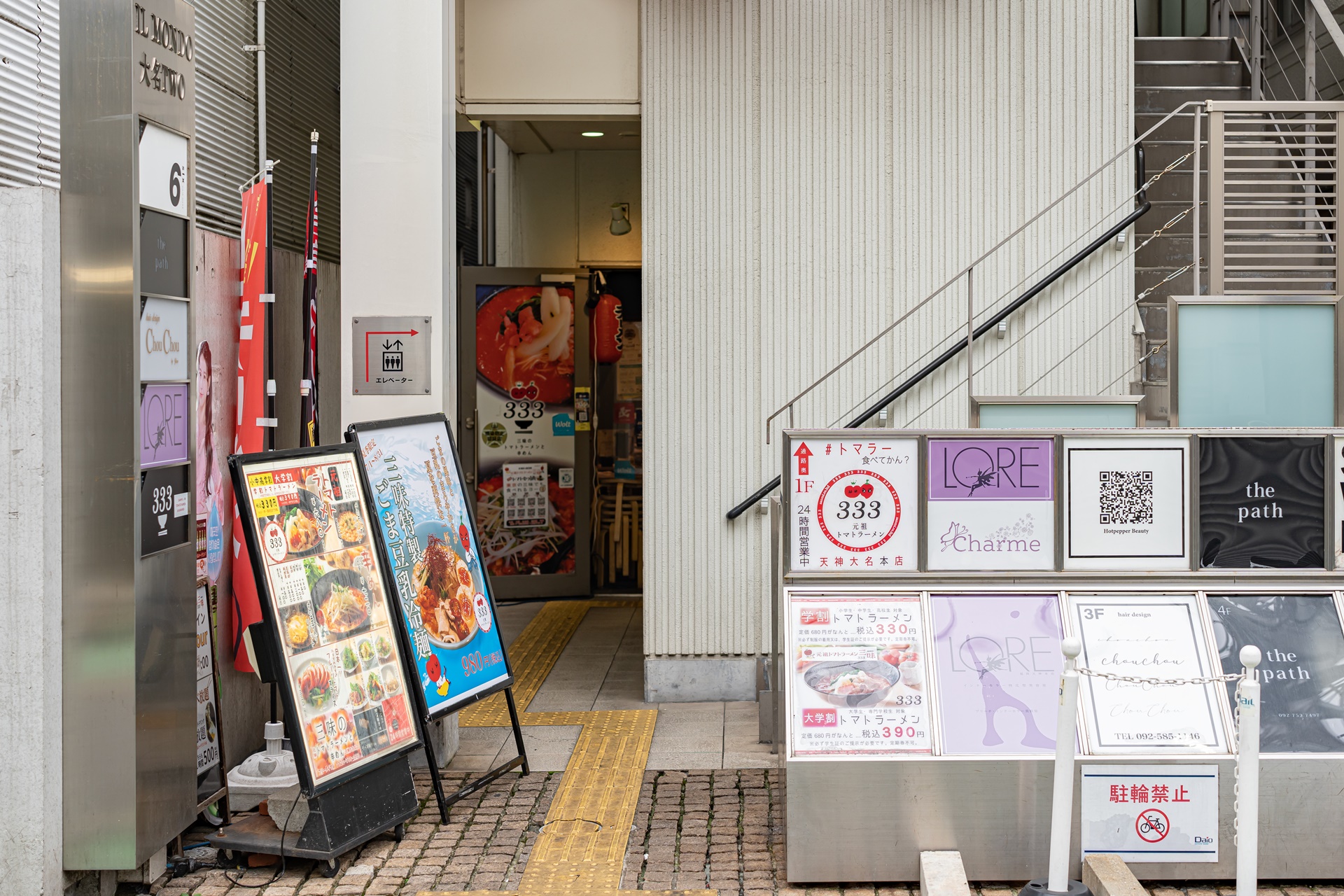 후쿠오카 원조 토마토 라멘 산미의 본점은 다이묘 거리 1층에 있습니다.