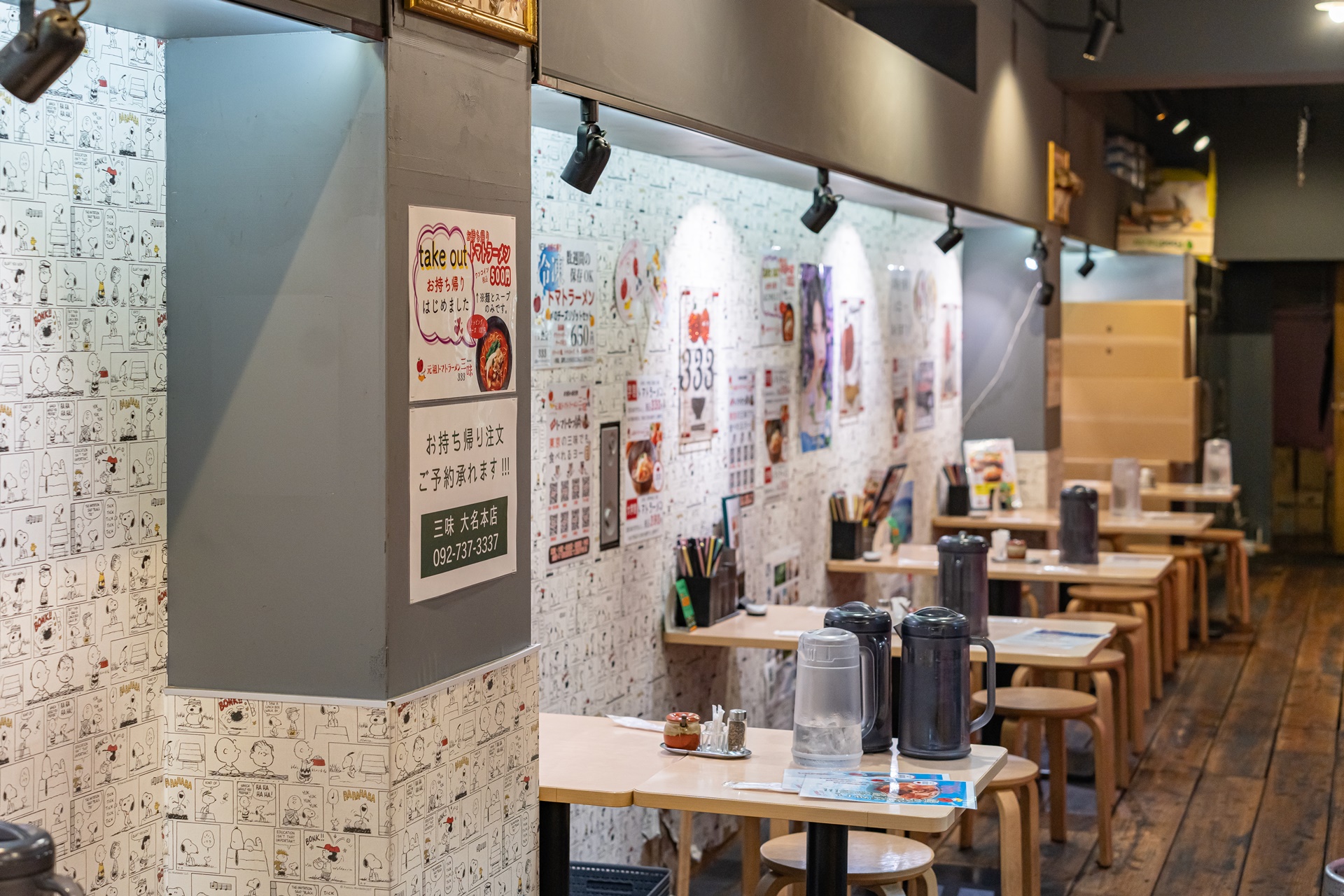 가게는 20명 정도가 들어갈 수 있는 자리가 있으며 이곳 다이묘 본점은 학생할인이 있어 후쿠오카의 학생들이 많이 찾아 학생들이 좋아할 만한 인테리어를 하고 있었습니다.