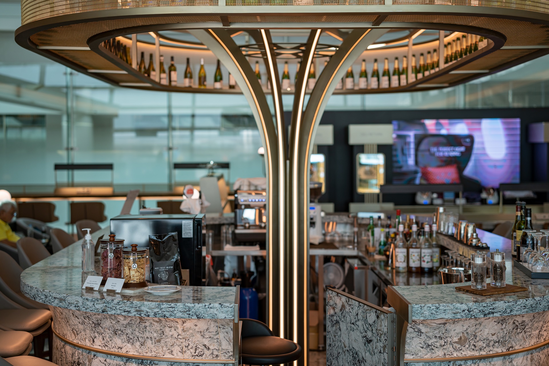 라운지 중앙에는 바가 설치되어 있어서 술과 음료, 카페 메뉴, 칵테일을 맛볼 수 있었습니다.