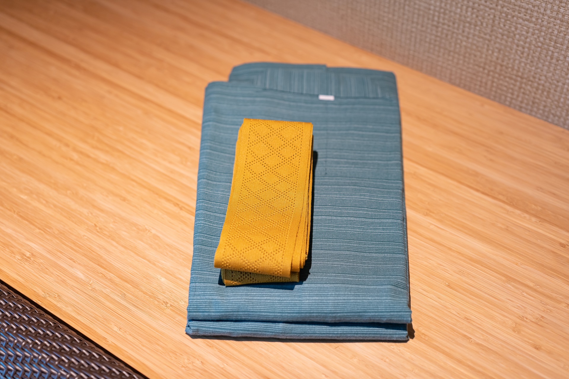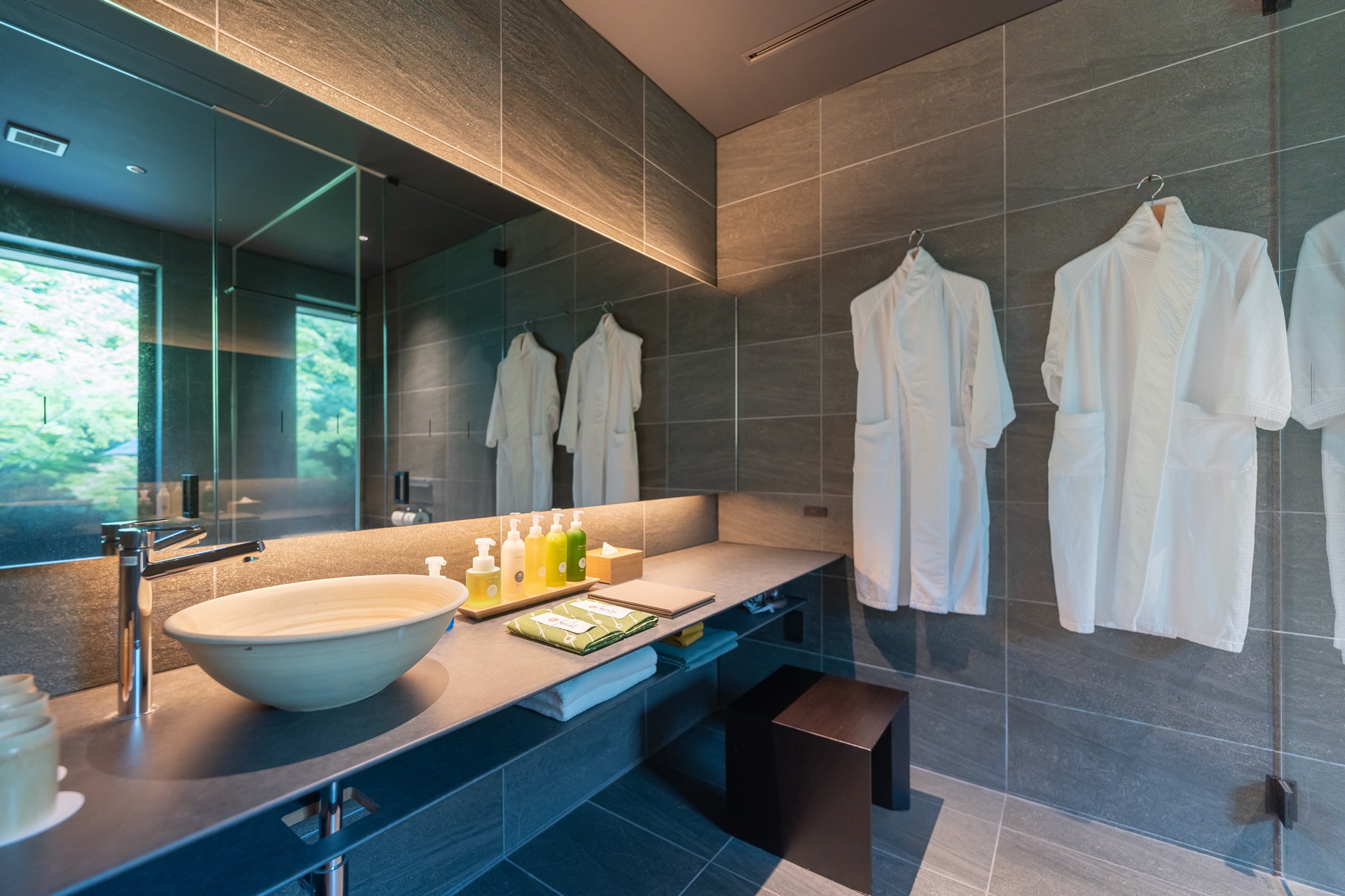 욕실에는 어메니티와 실내복이 잘 정리되어 있었습니다.