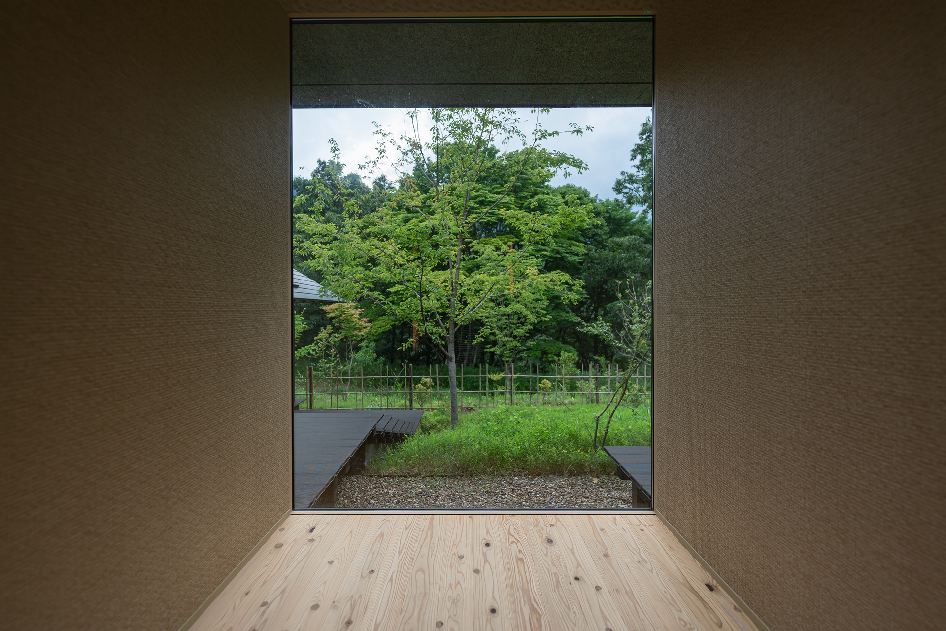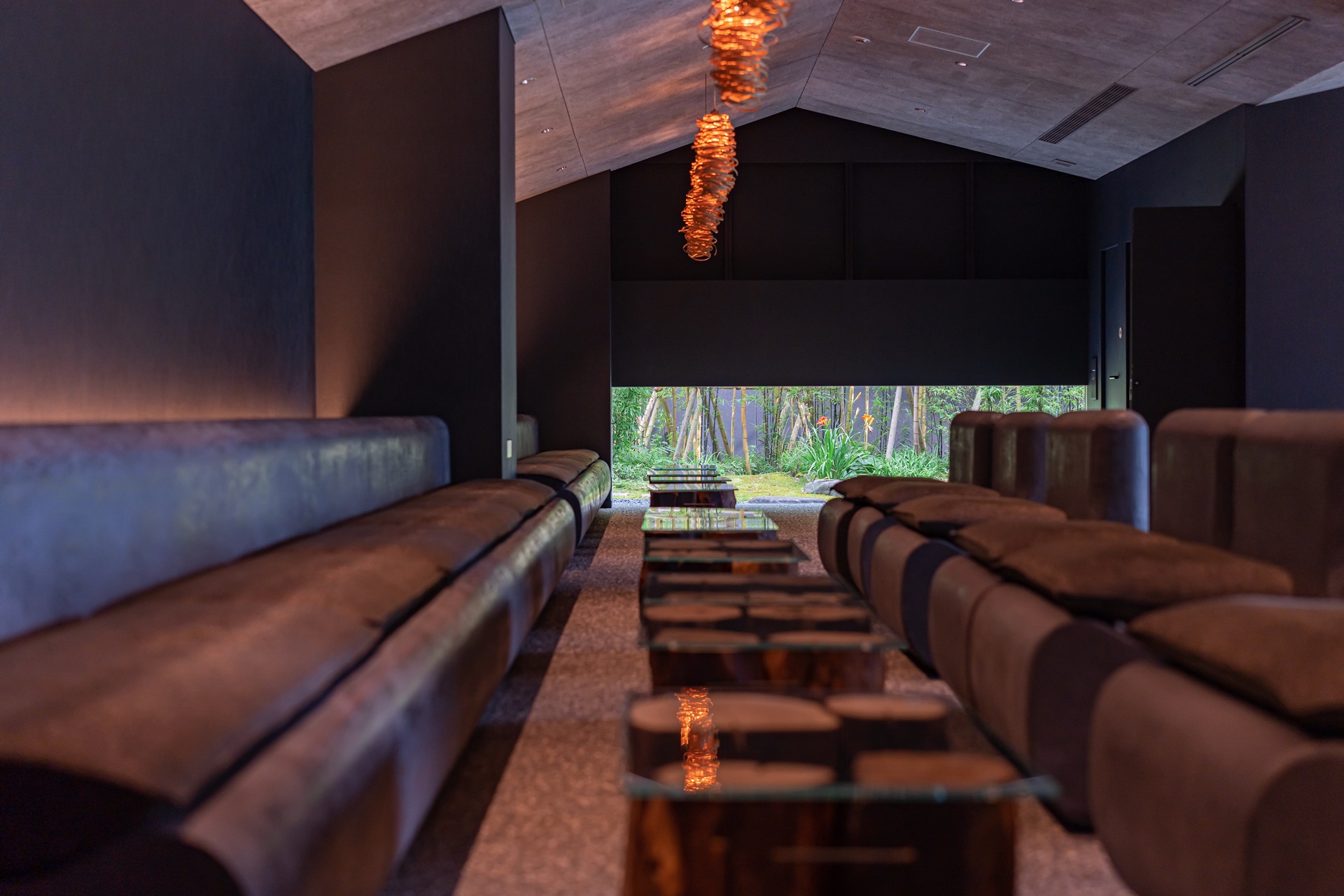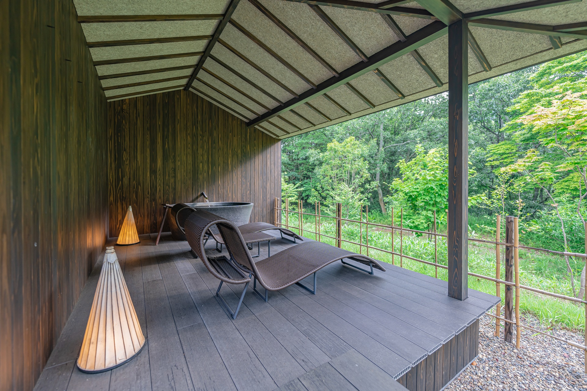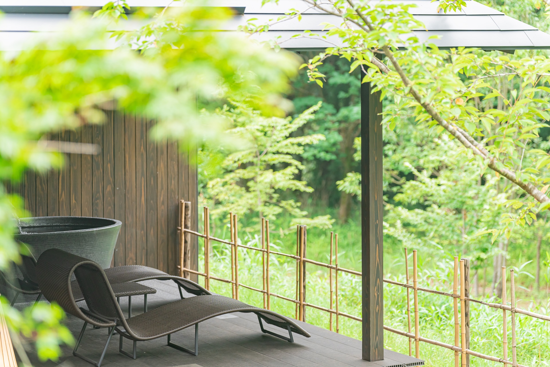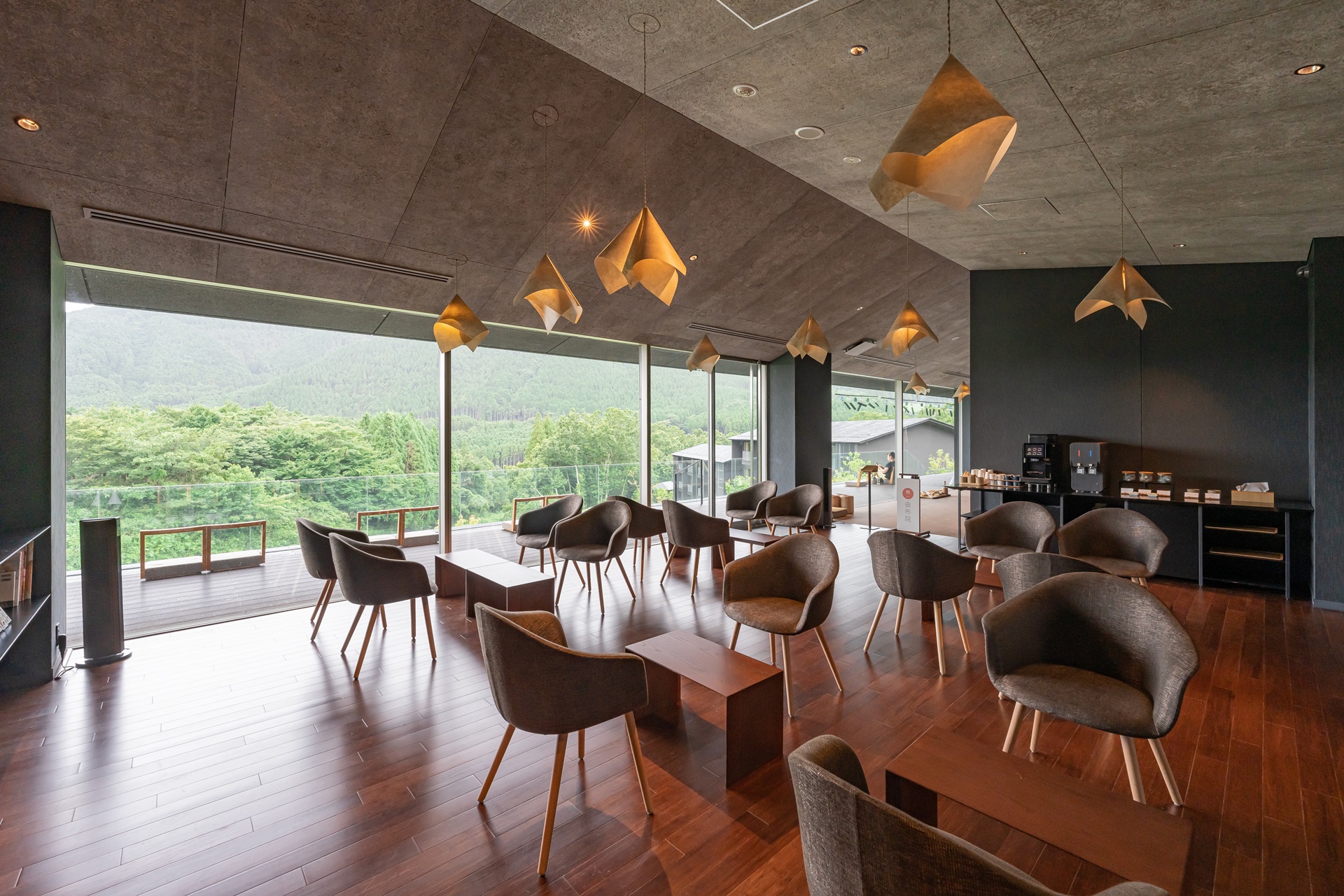 거실의 모습입니다. 유후인의 숲속을 바라보며 휴식을 취할 수 있고 다다미 위에 나무로 만든 소파가 놓여 있습니다.