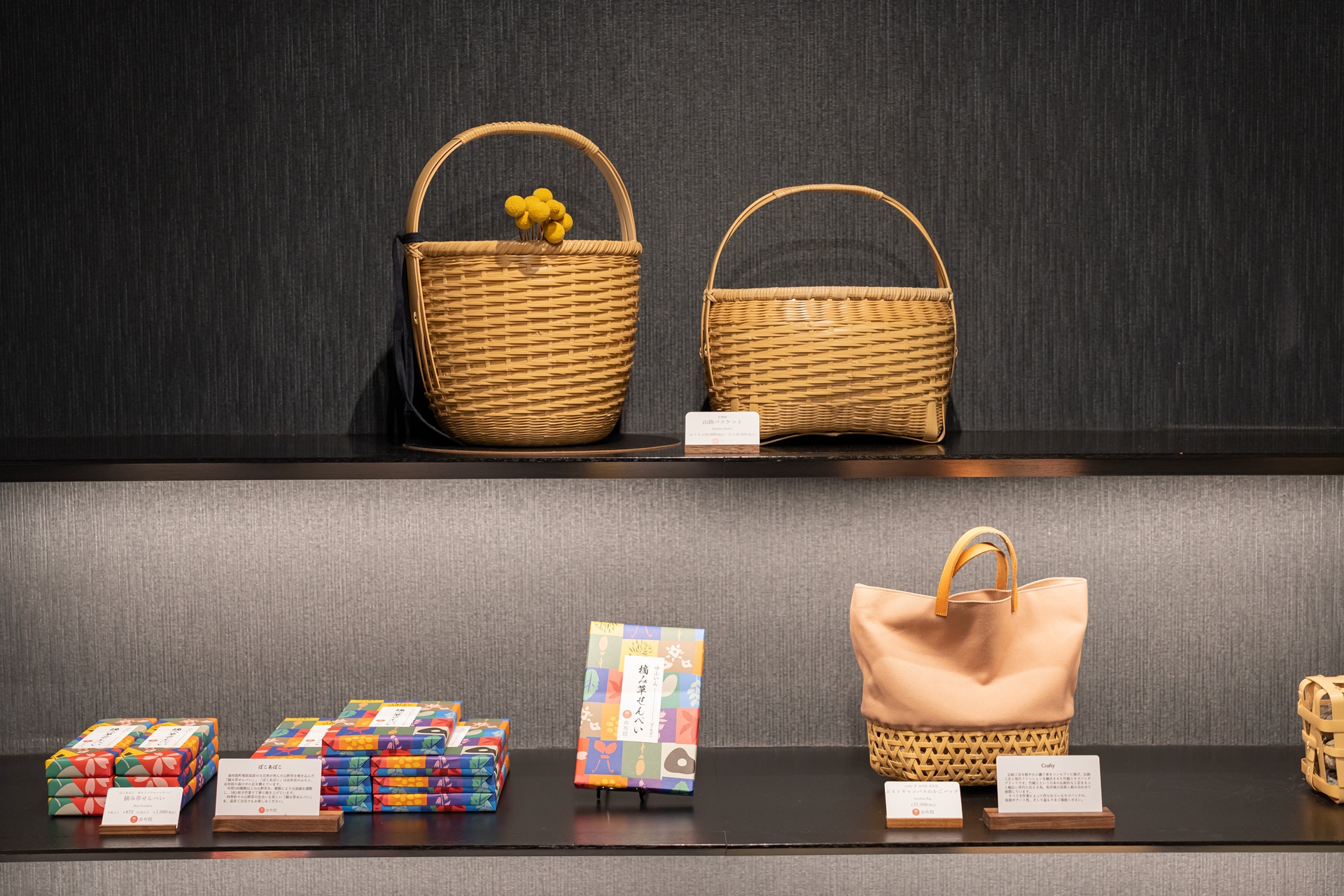오이타의 대나무로 만든 제품들이 많이 보이고 간단한 먹거리도 보입니다.