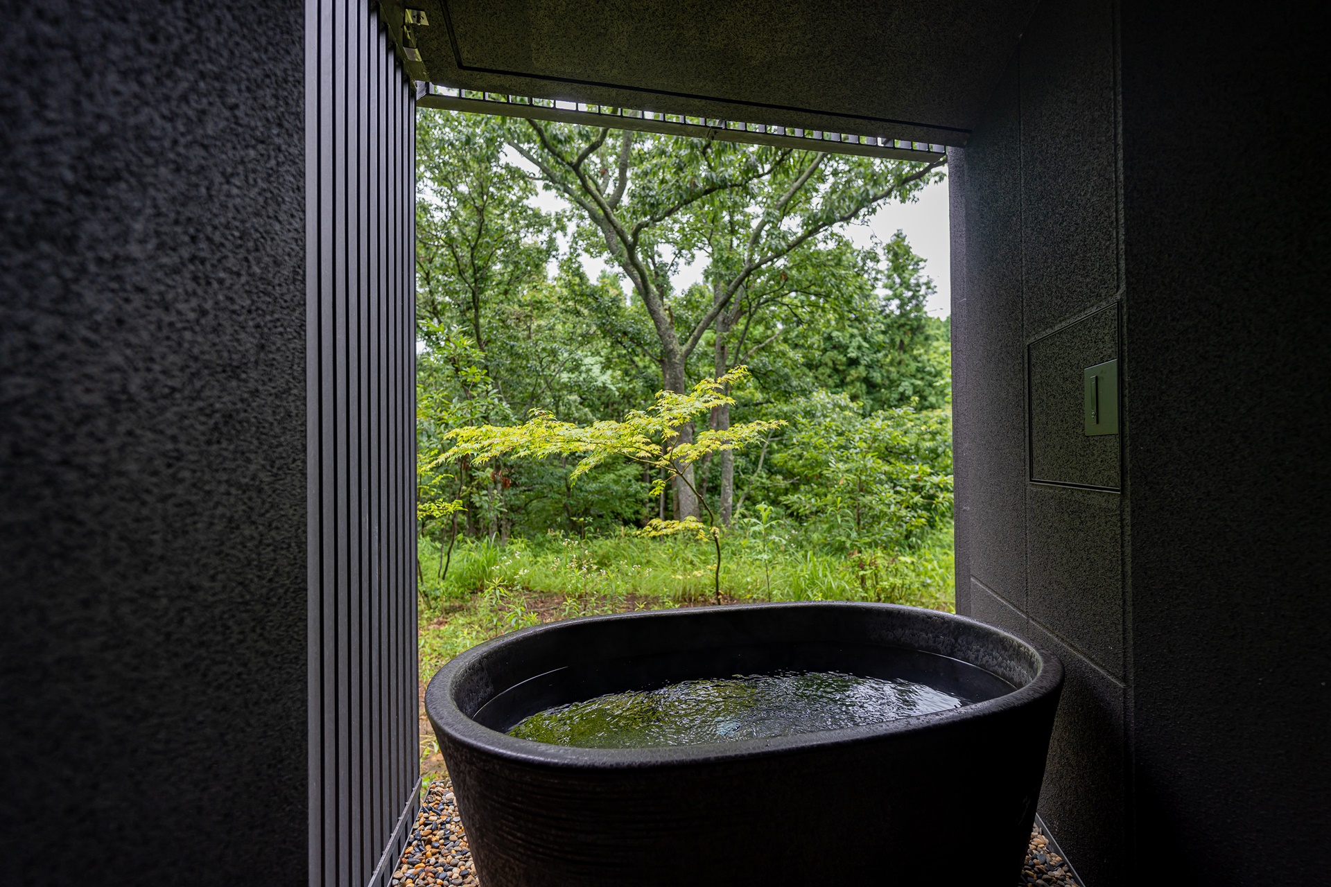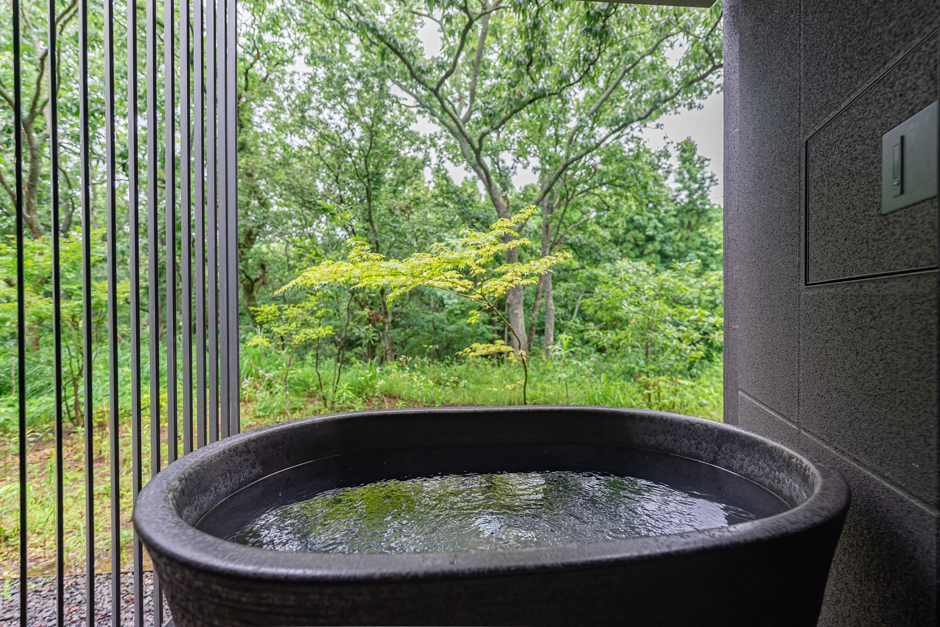 유후인의 자연을 만끽할 수 있는 노천 온천 욕조가 나옵니다.