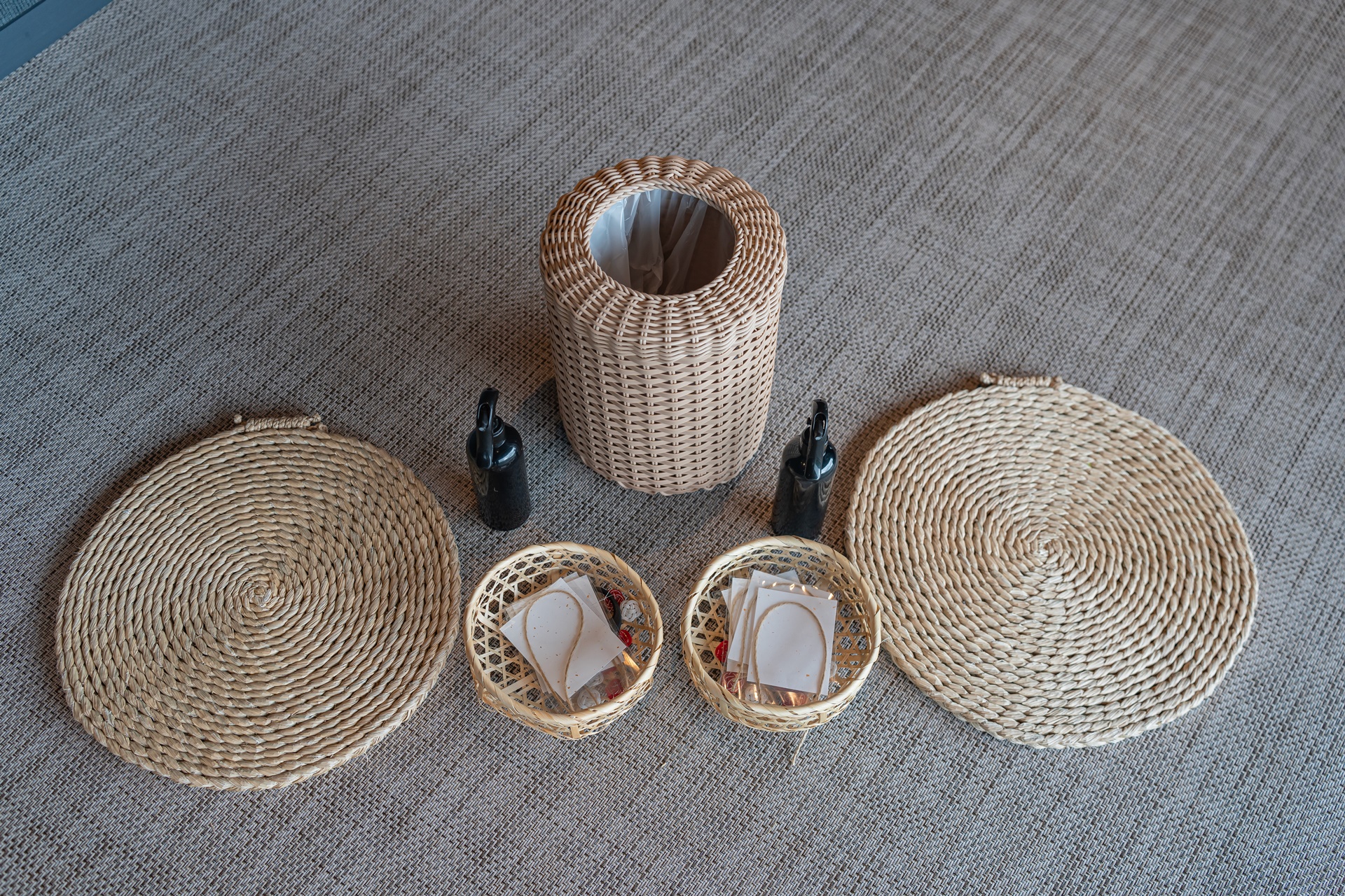 볏짚으로 만든 방석과 쓰레기통, 바구니, 볏집을 부드럽게 해주는 분무기