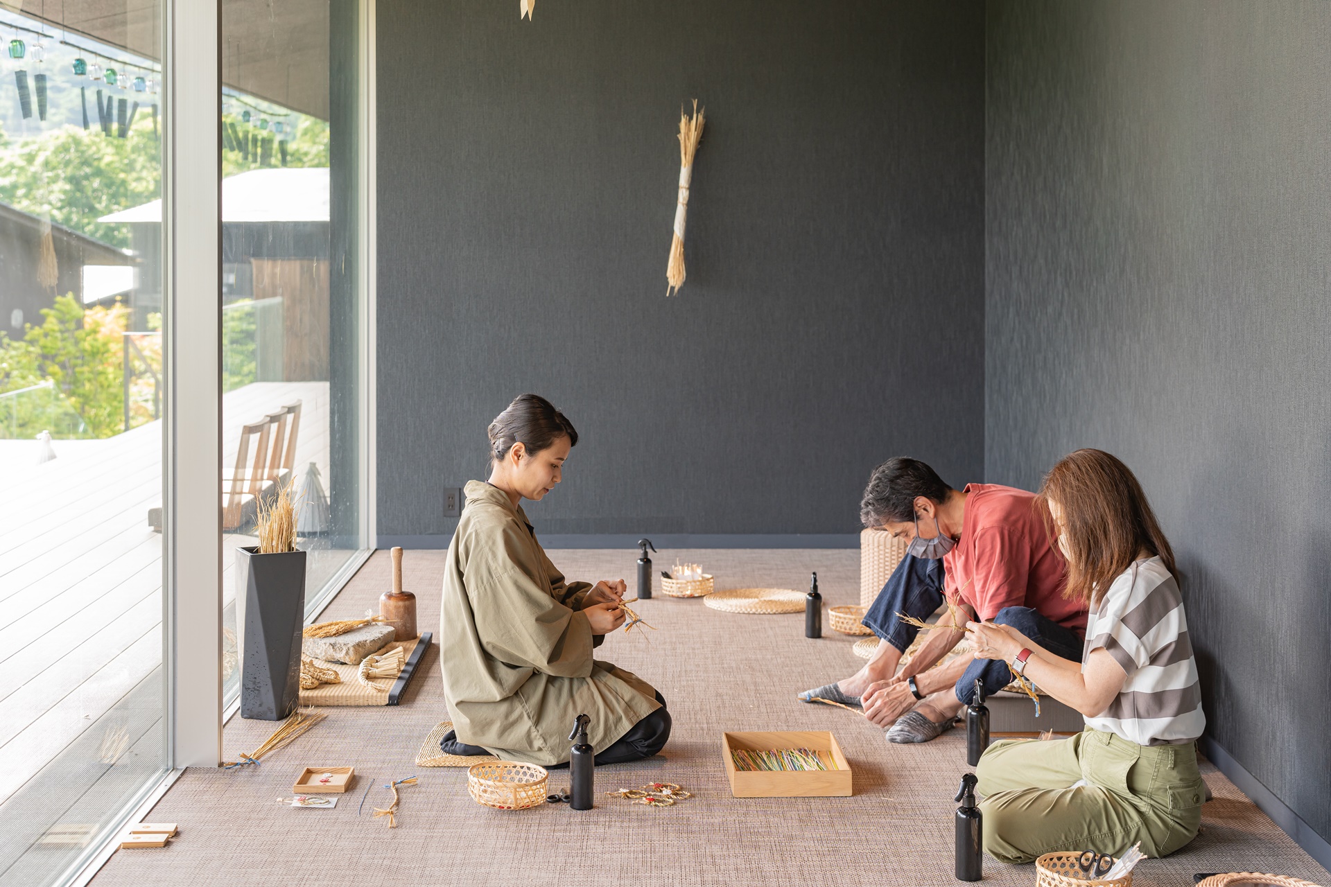 강사는 호시노 리조트 카이 유후인의 직원으로 체크인 할때 카운터, 아침에는 체조, 중간중간 새끼 꼬기 등 너무 다양한 일을 하고 있는 것 같습니다.