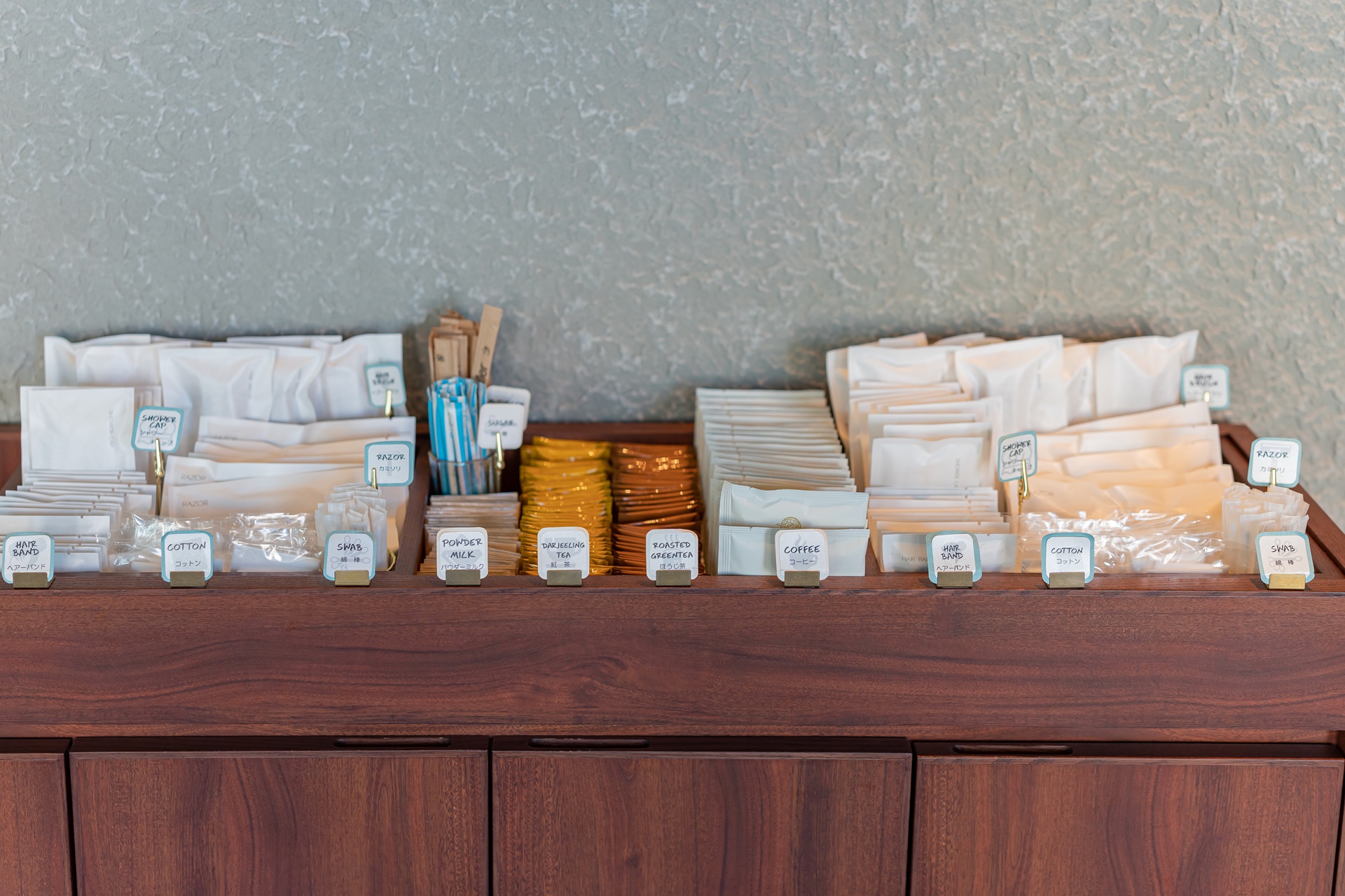 일회용 어메니티는 다양한 종류로 로비 옆의 공간에 설치되어 있어 마음껏 가져갈 수 있었습니다.