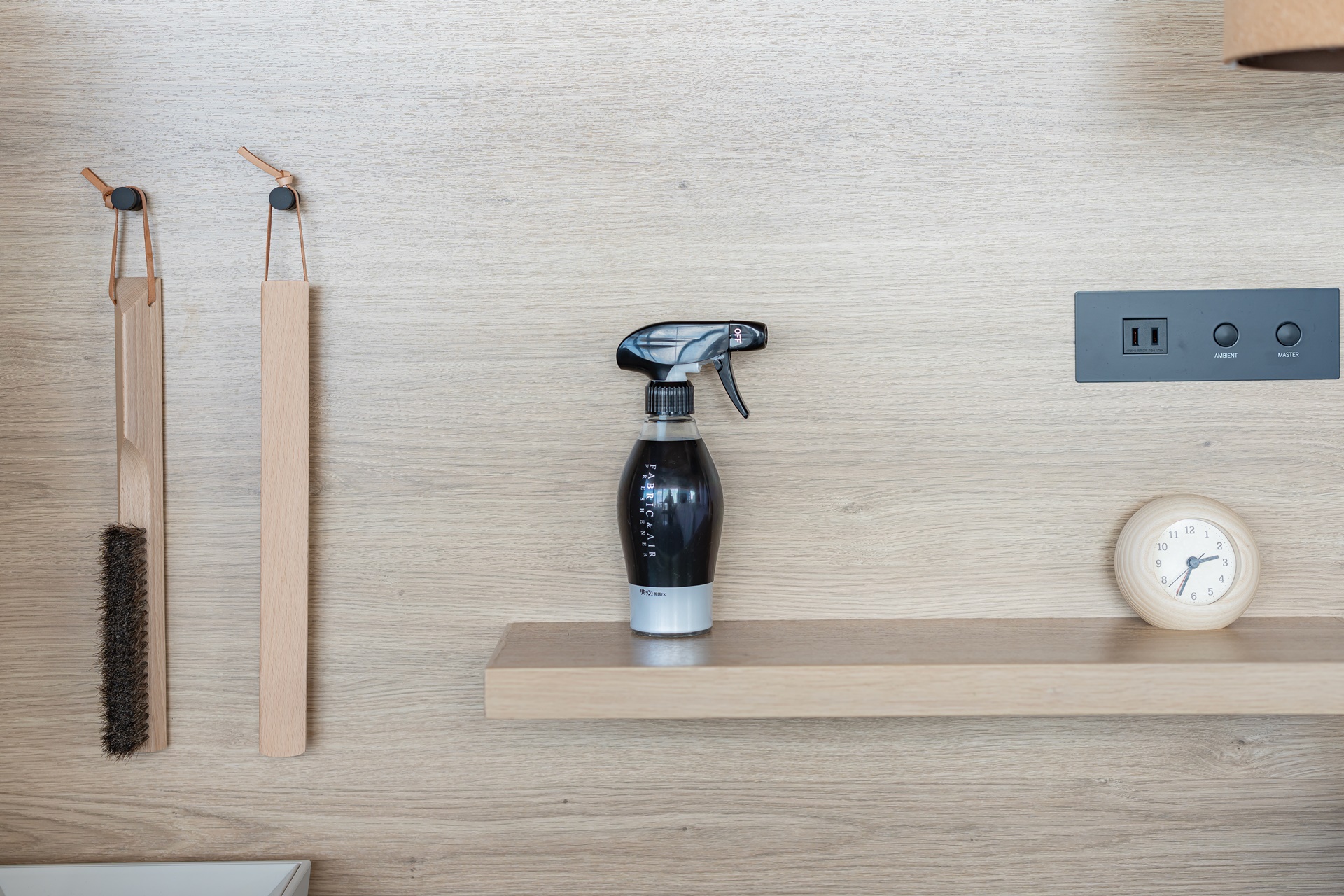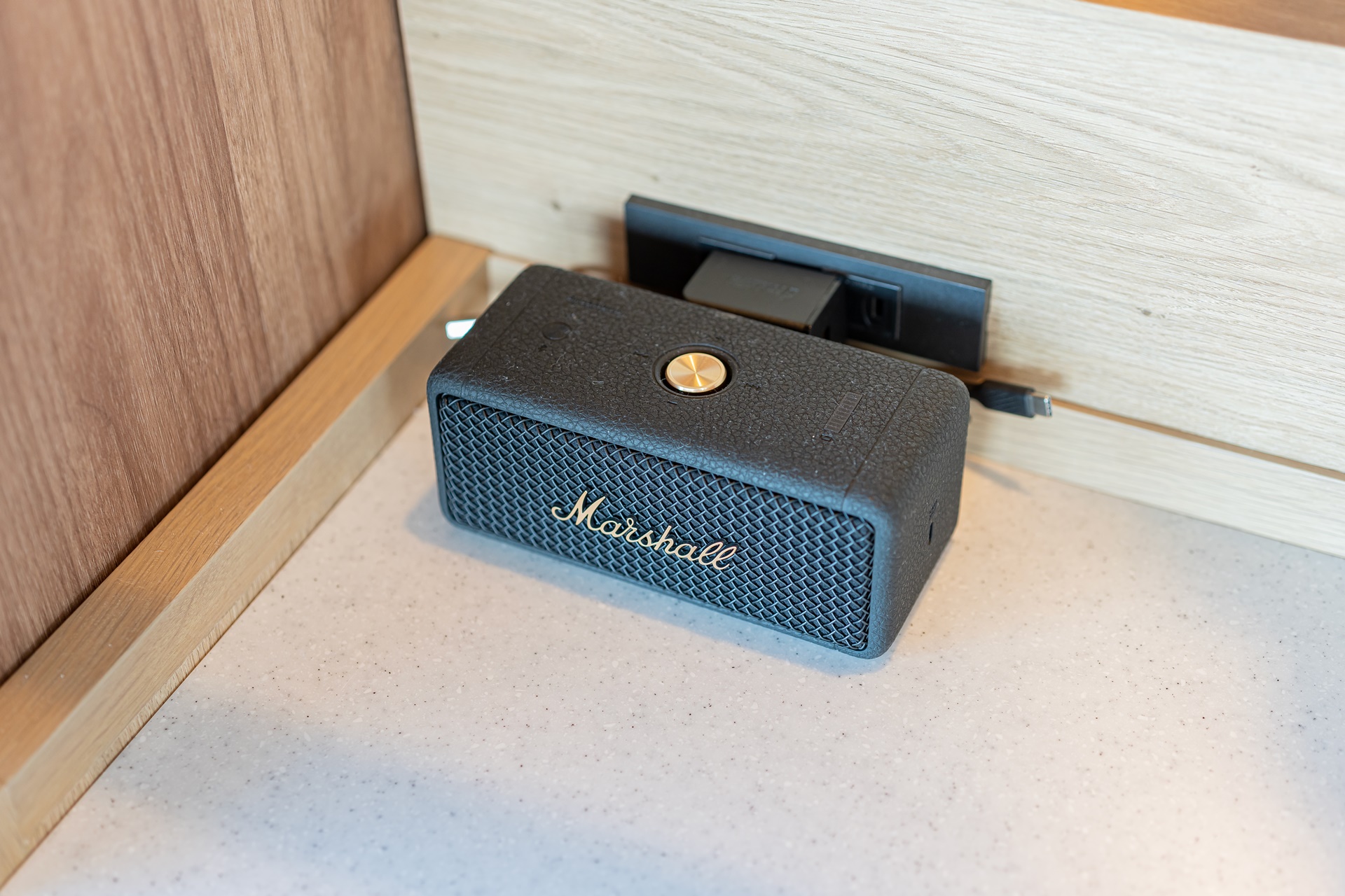 콘센트가 없고 USB 포트가 없어 찾았는데 선반 위 스피커와 함께 그 뒤에 USB 충전 어뎁터가 있었습니다.