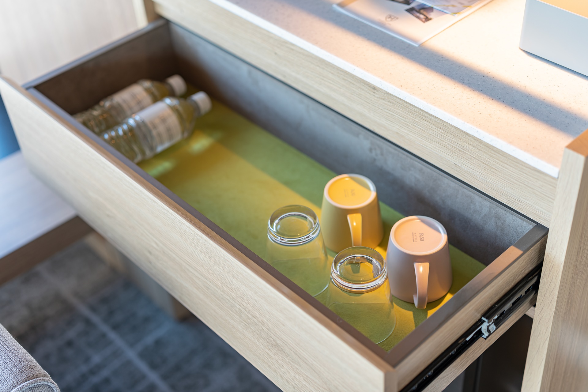 서랍안에 물과 컵이 숨겨져 있었습니다.