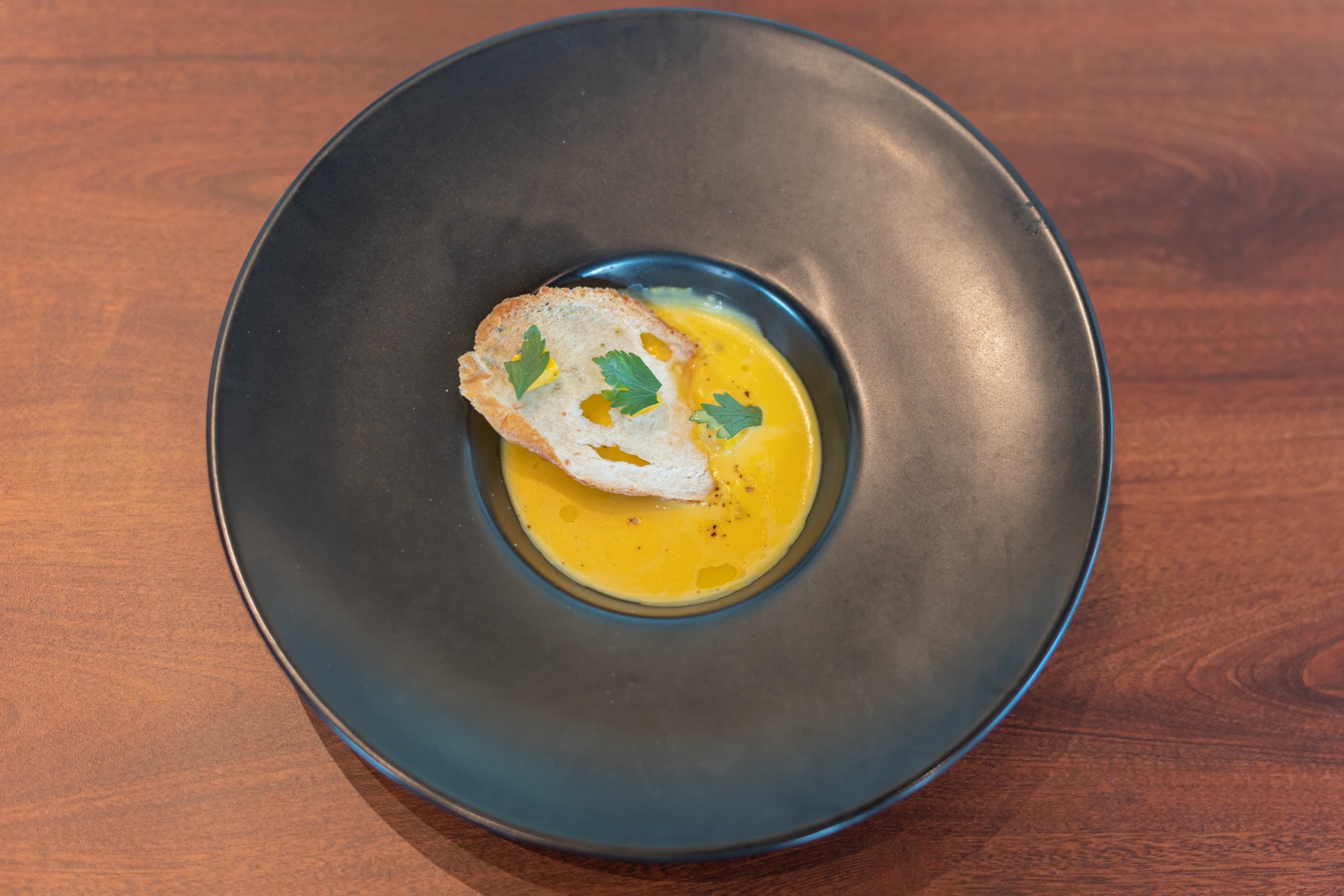콘 스프에 얇게 썬 바게트