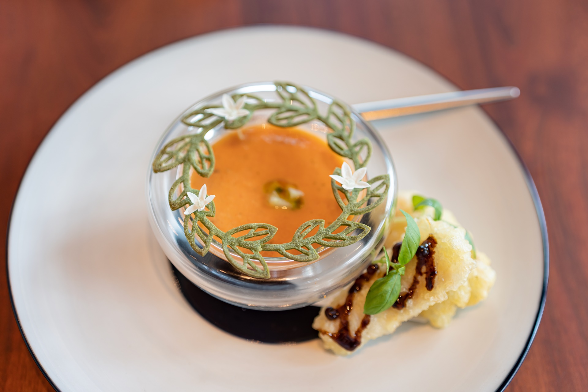 호박스프, 아이스크림, 초코케이크, 과일 절임 등이 이쁘게 담겨 있습니다.
