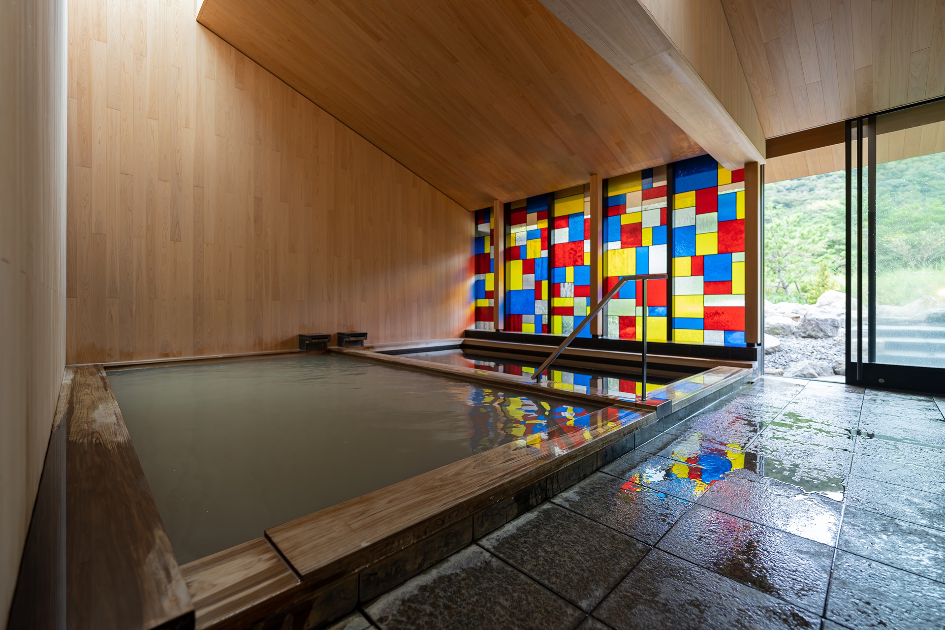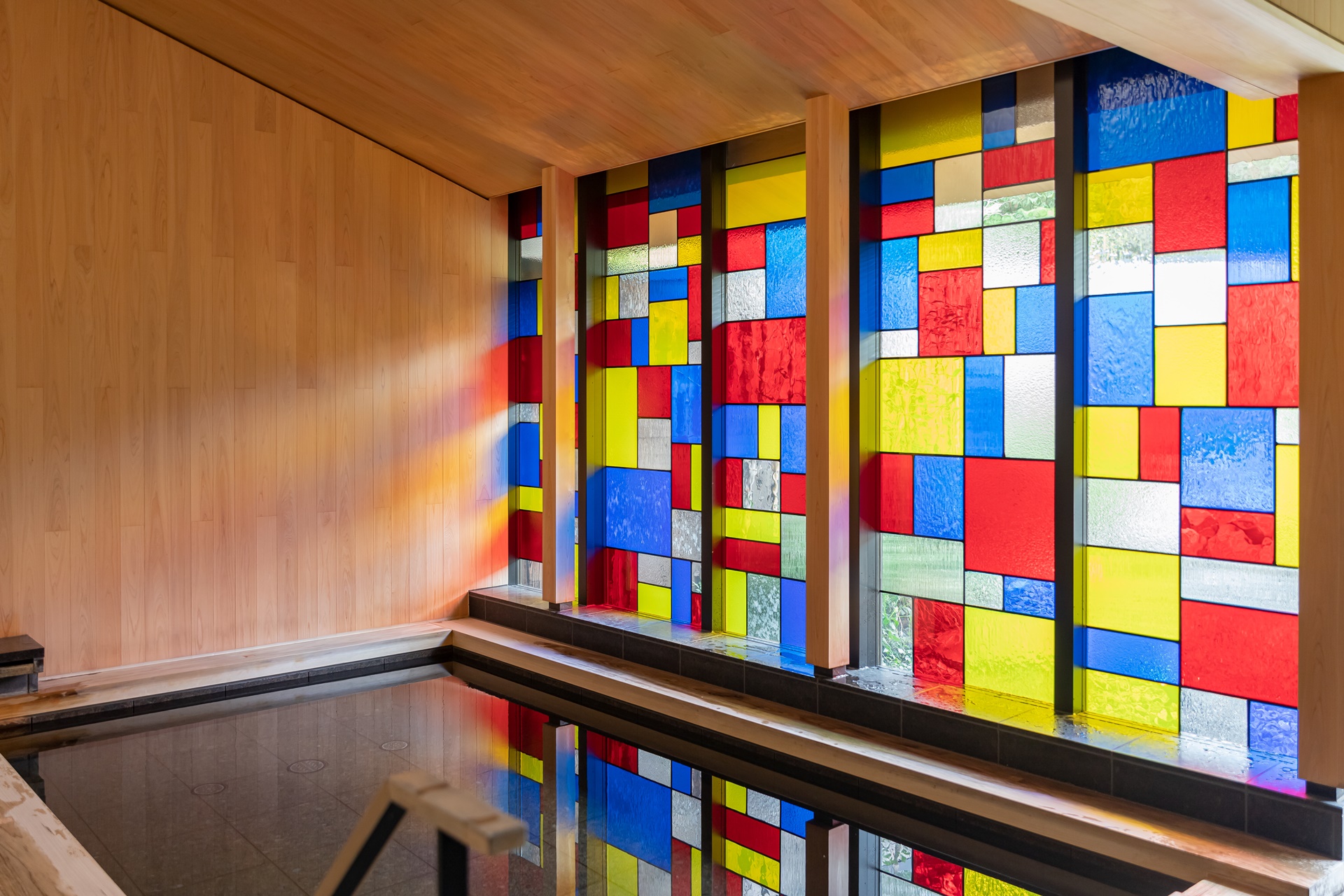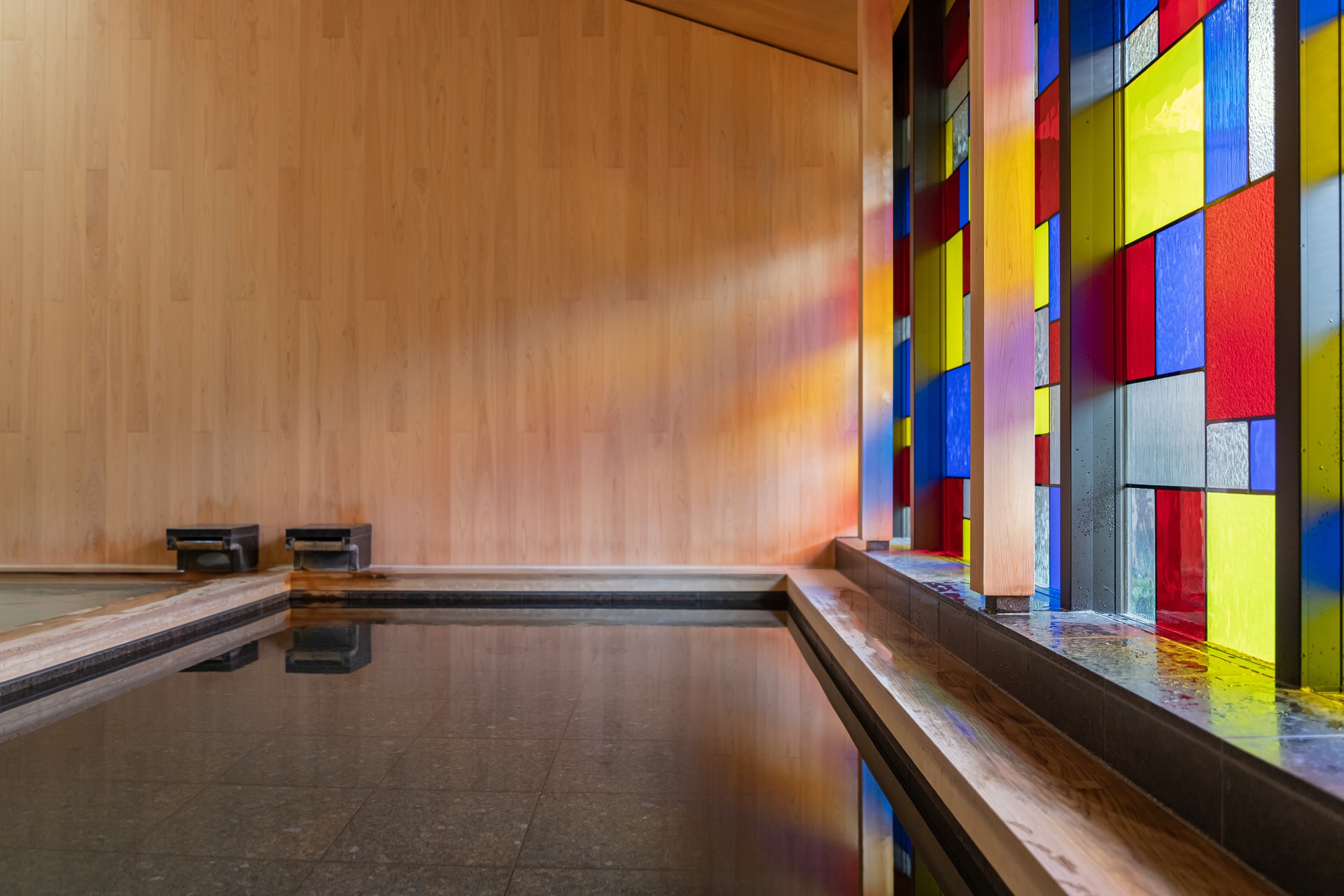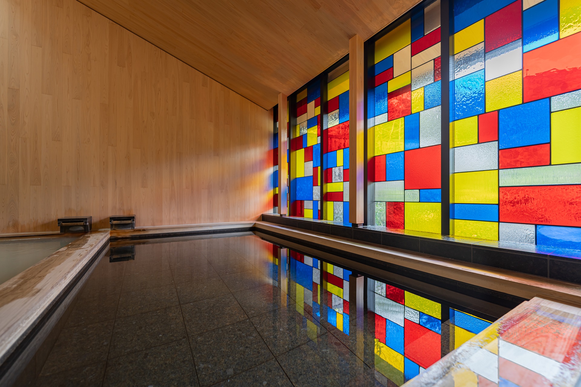 실내 온천 한쪽의 창이 나가사키의 유리공예인 비드로(長崎びいどろ, Vidro) 으로 장식되어 있어 여기에 해가 비쳐 온천을 멋진 빛으로 물들입니다.