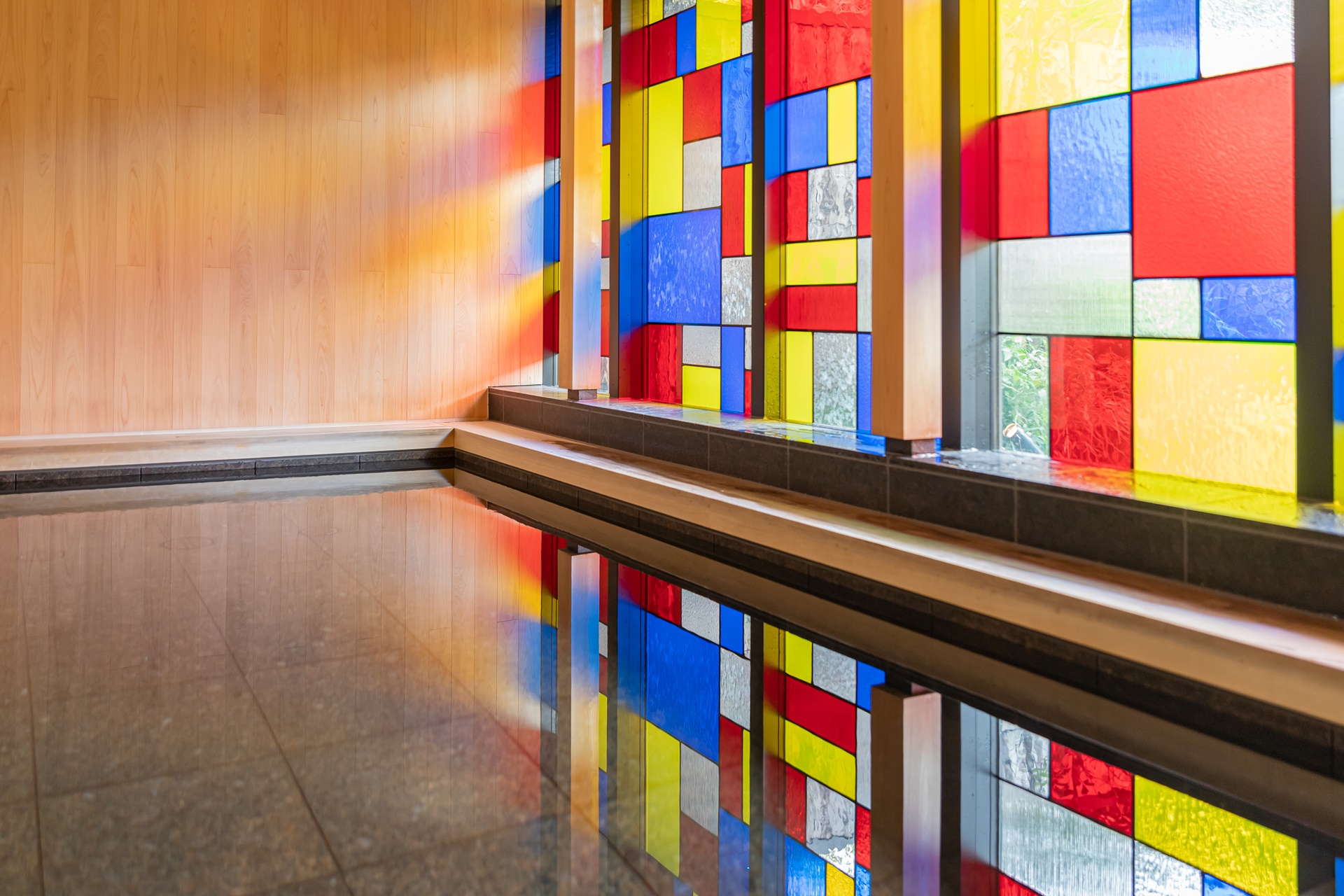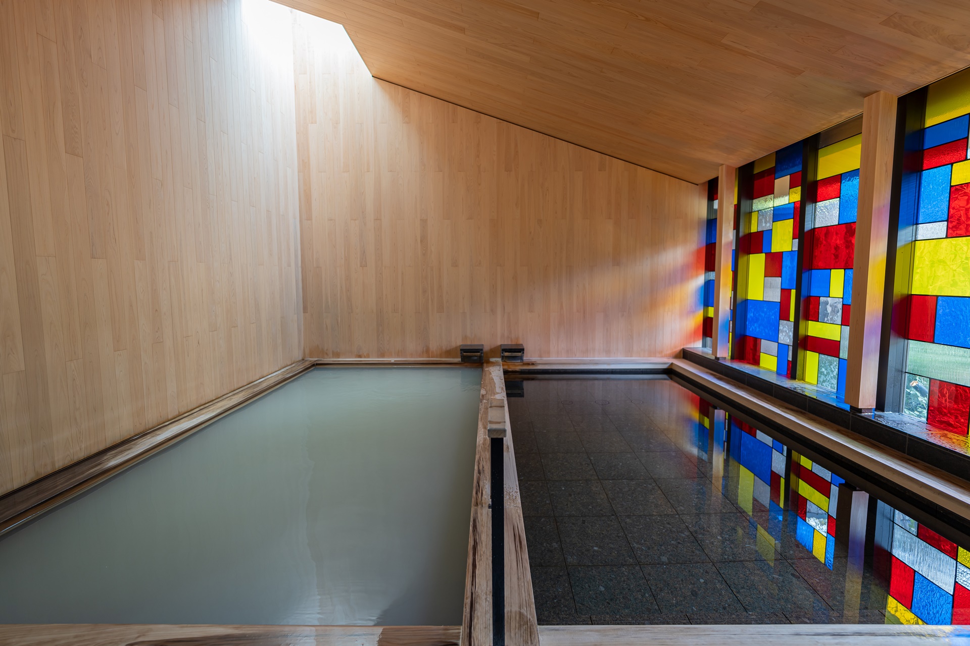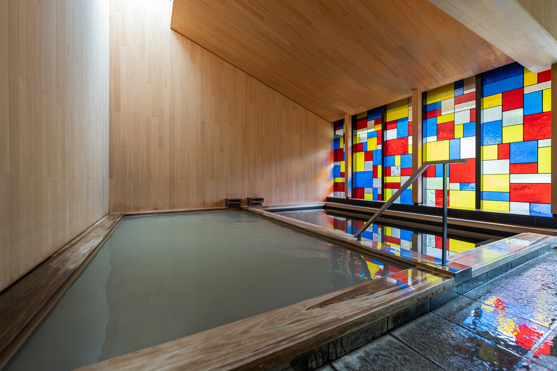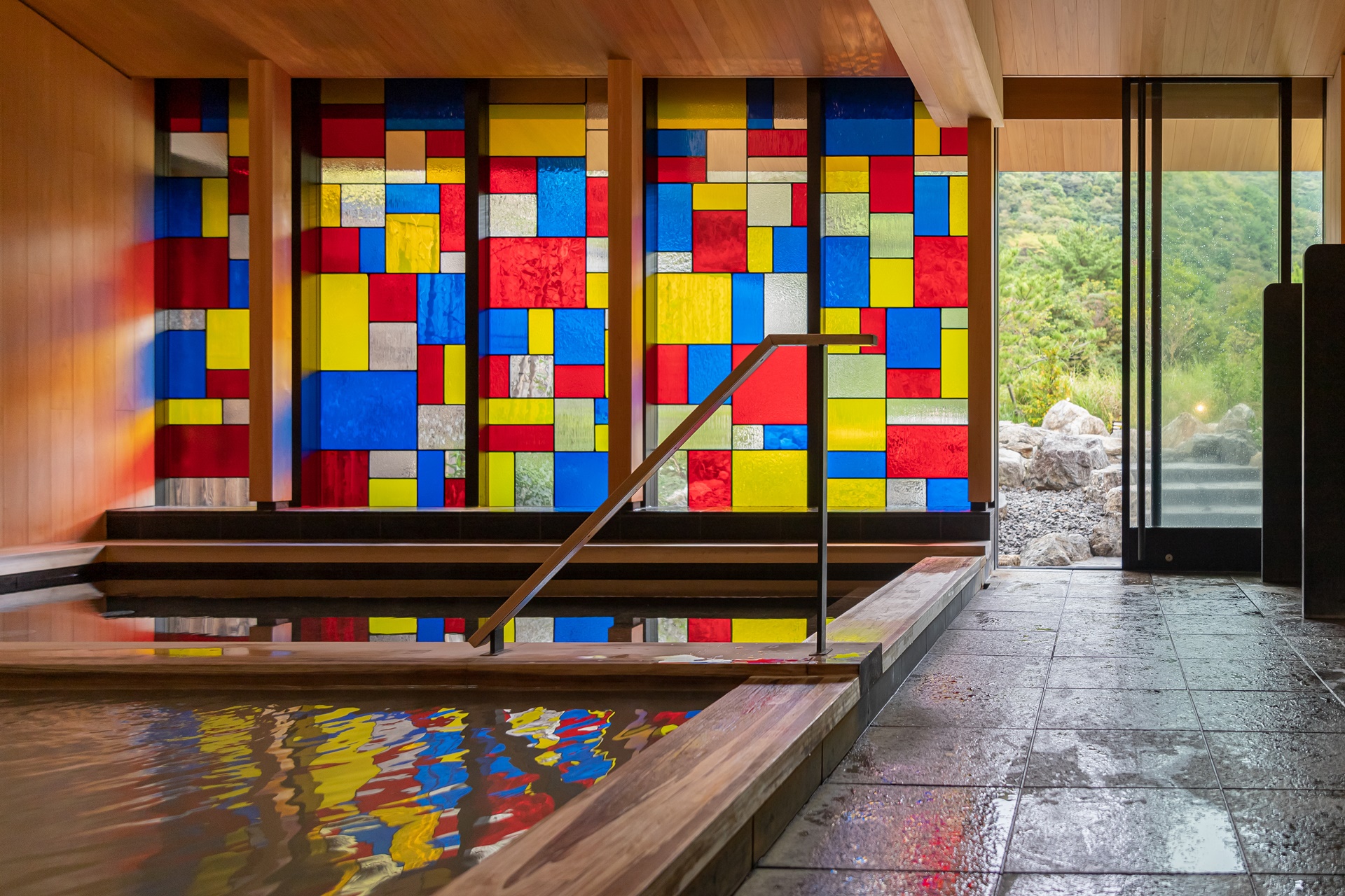 실내 온천 한쪽의 창이 나가사키의 유리공예인 비드로(長崎びいどろ, Vidro) 으로 장식되어 있어 여기에 해가 비쳐 온천을 멋진 빛으로 물들입니다.
