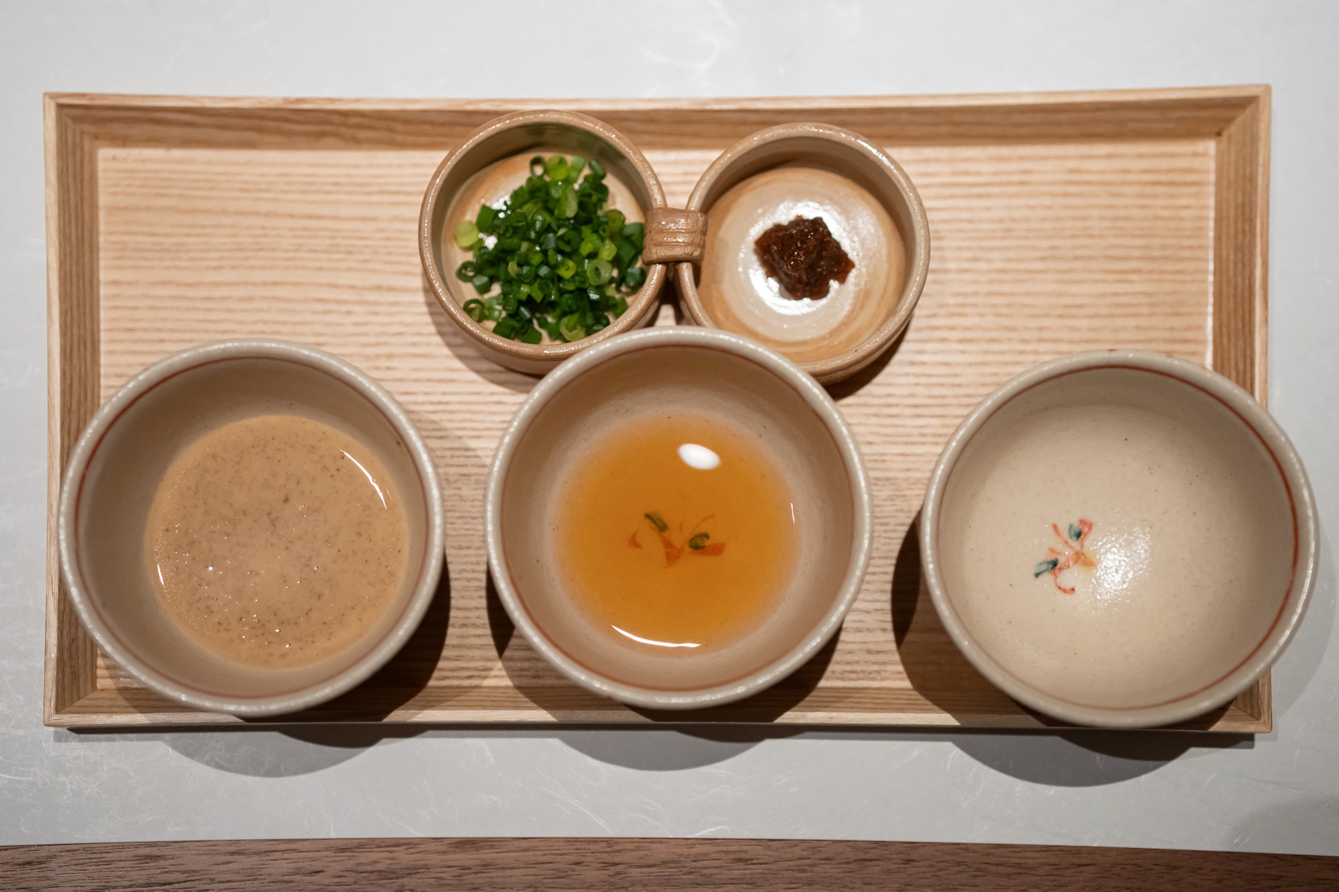 샤브샤브는 따로 준비된 참깨 소스, 비파 간장 소스에 찍어 먹습니다.