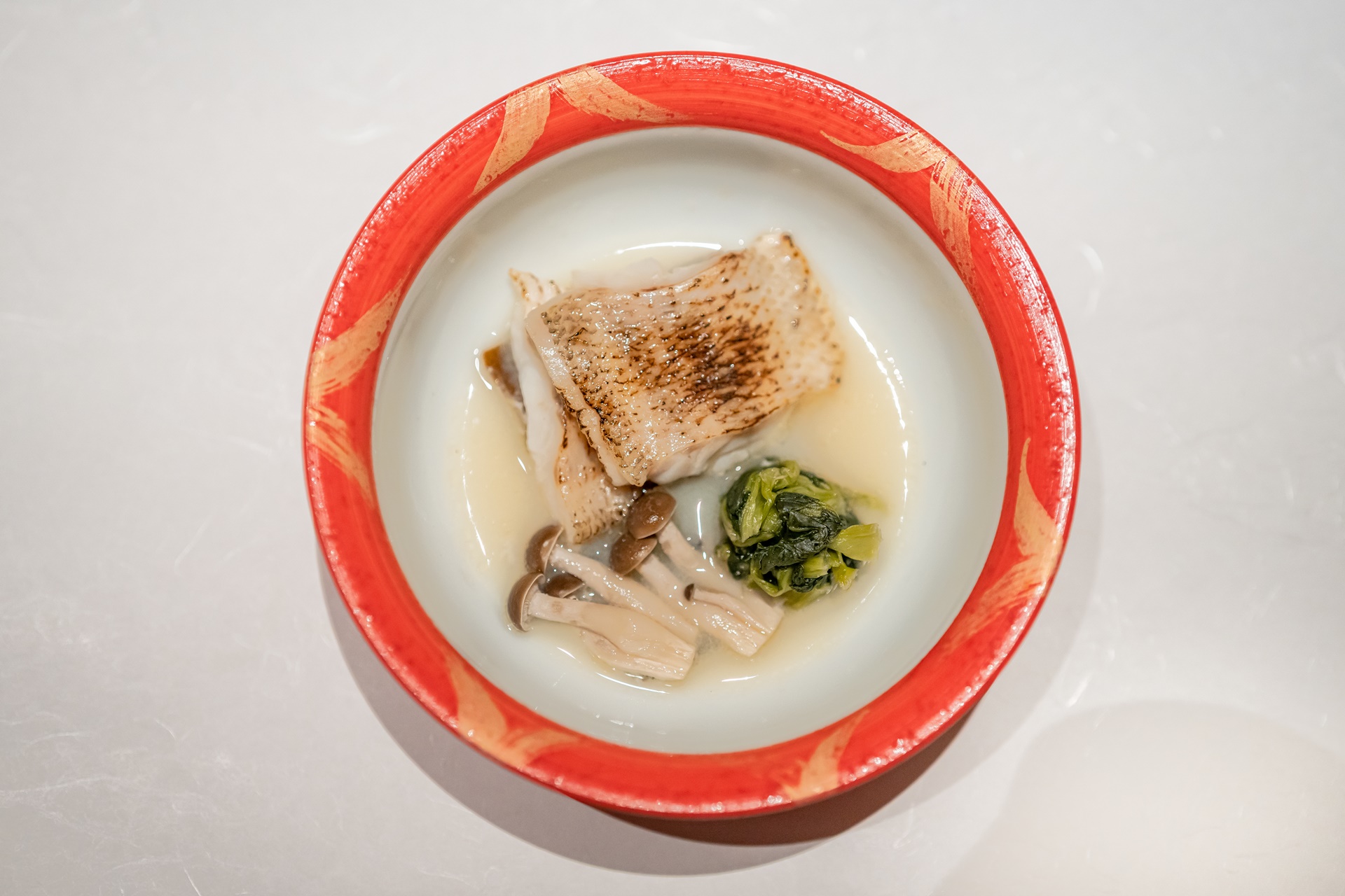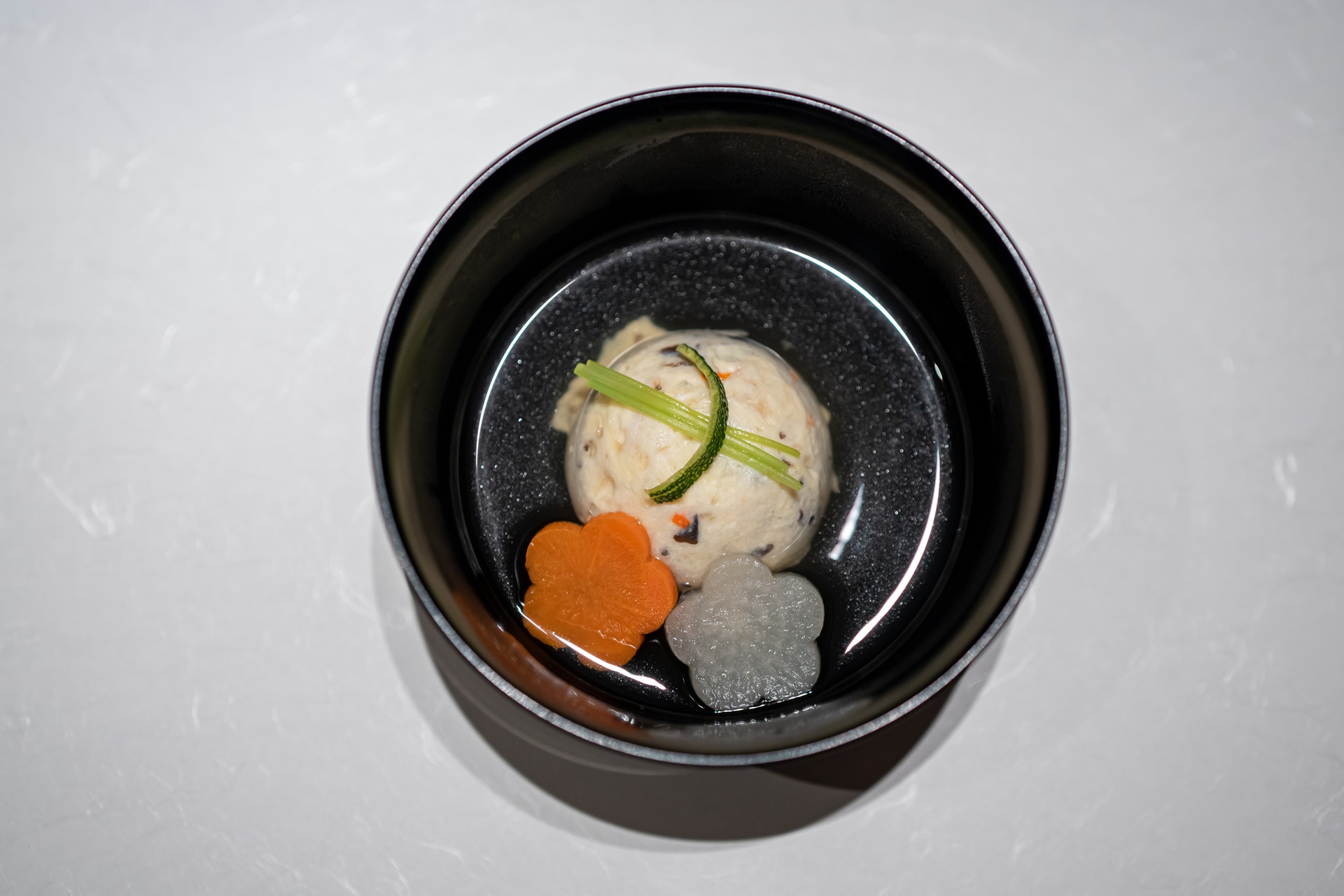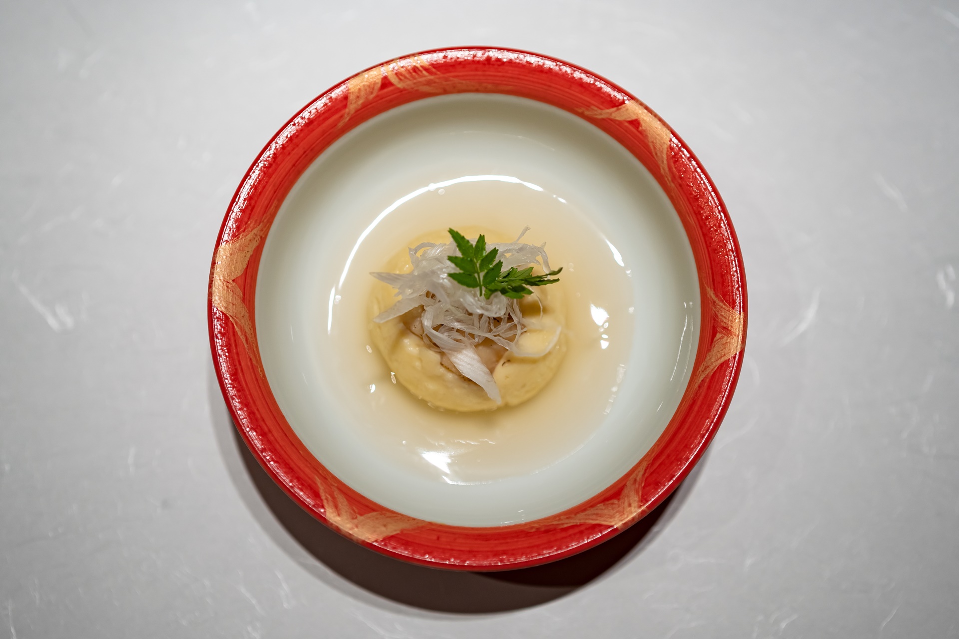 찜요리는 호타테 신죠(가리비를 사용한 일본요리)에 도미 육수를 사용한 소스를 뿌리고 위에 새싹을 올렸습니다.