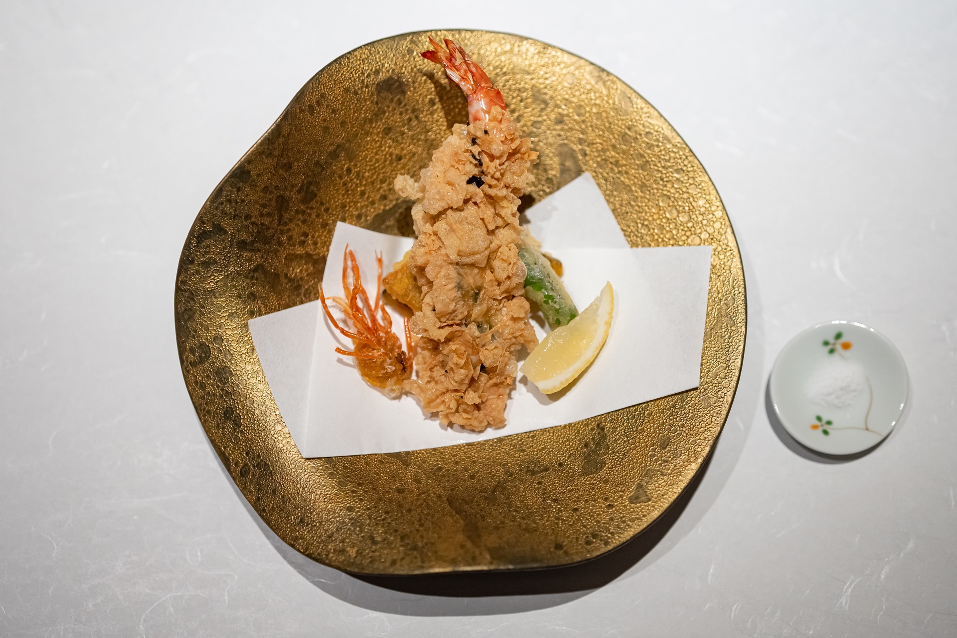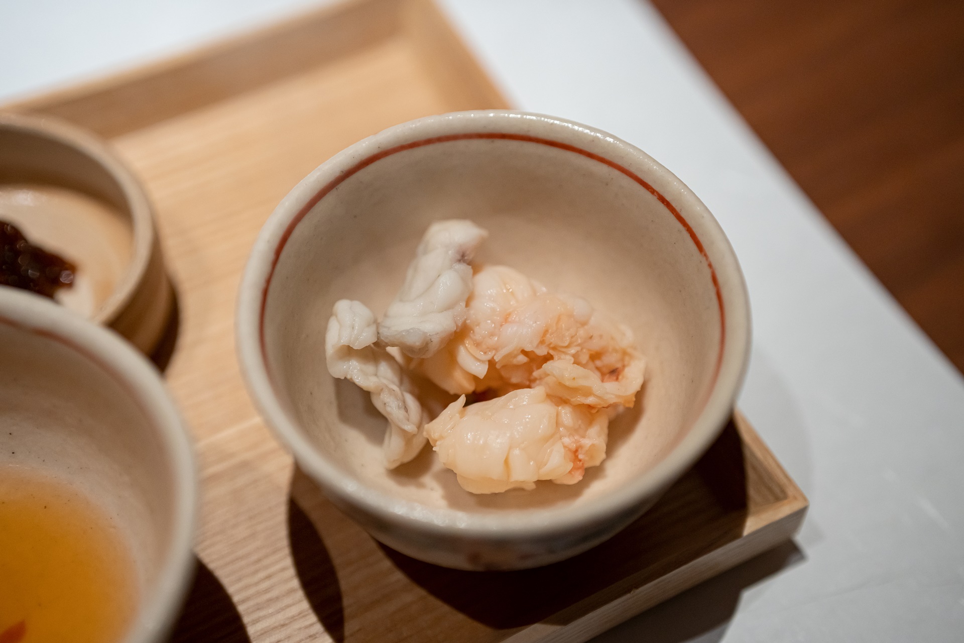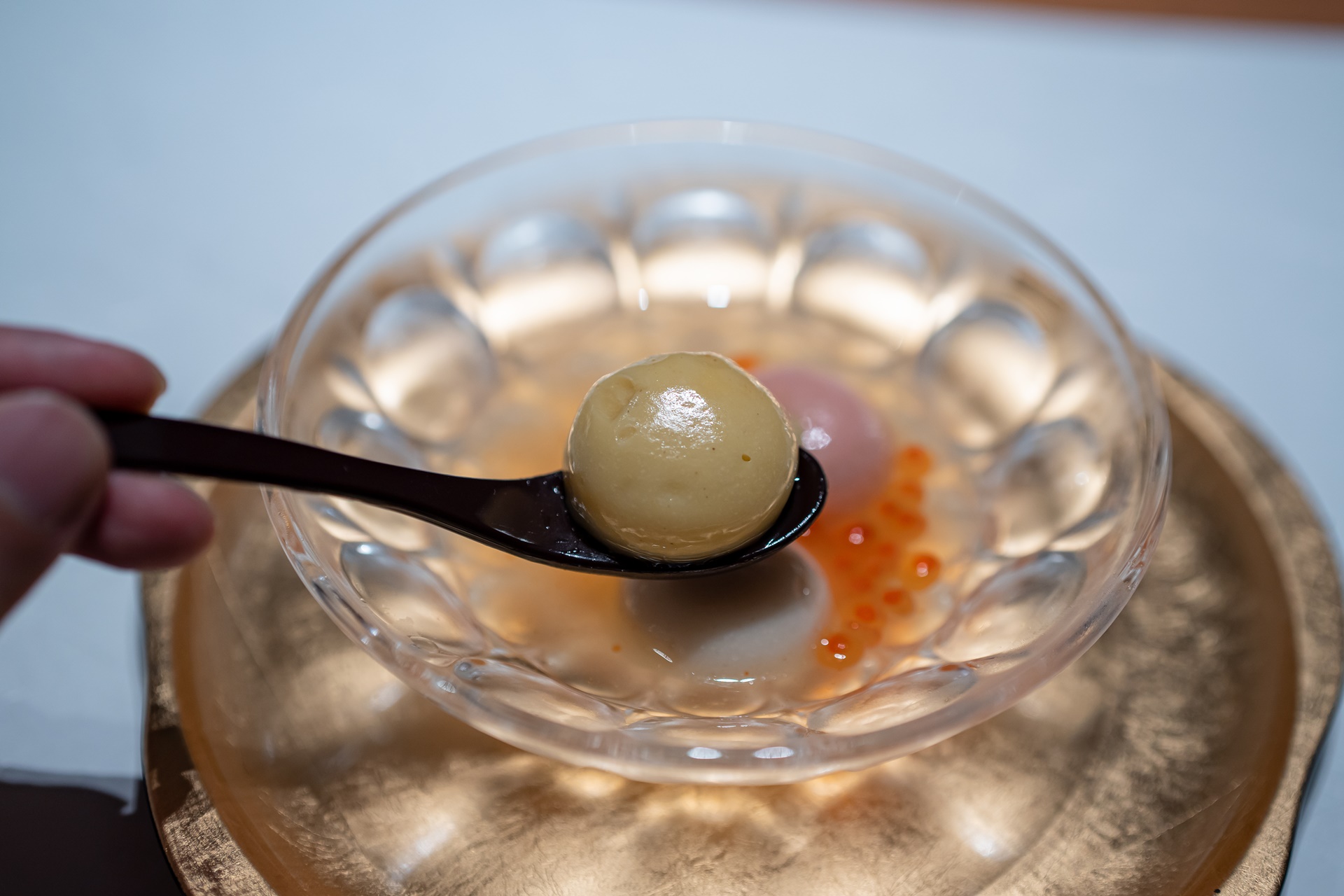찜요리는 호타테 신죠(가리비를 사용한 일본요리)에 도미 육수를 사용한 소스를 뿌리고 위에 새싹을 올렸습니다.