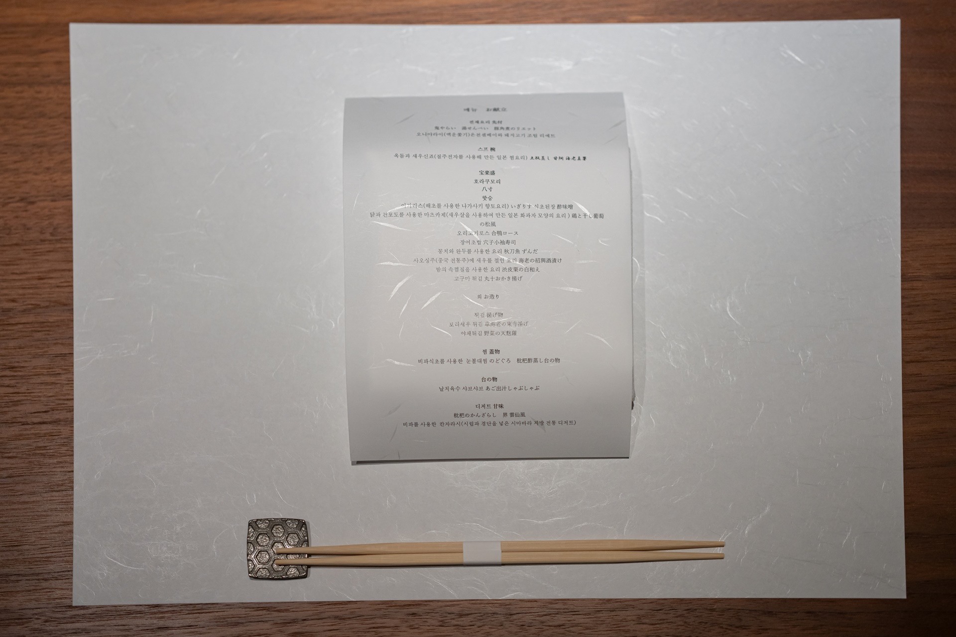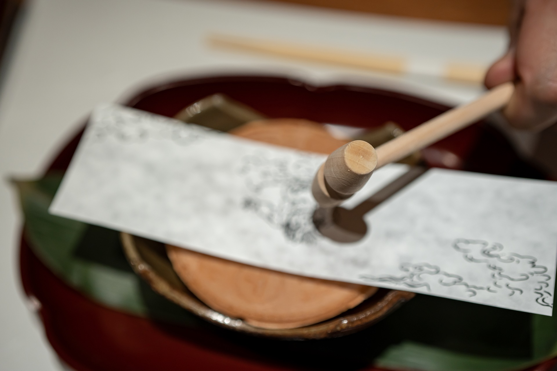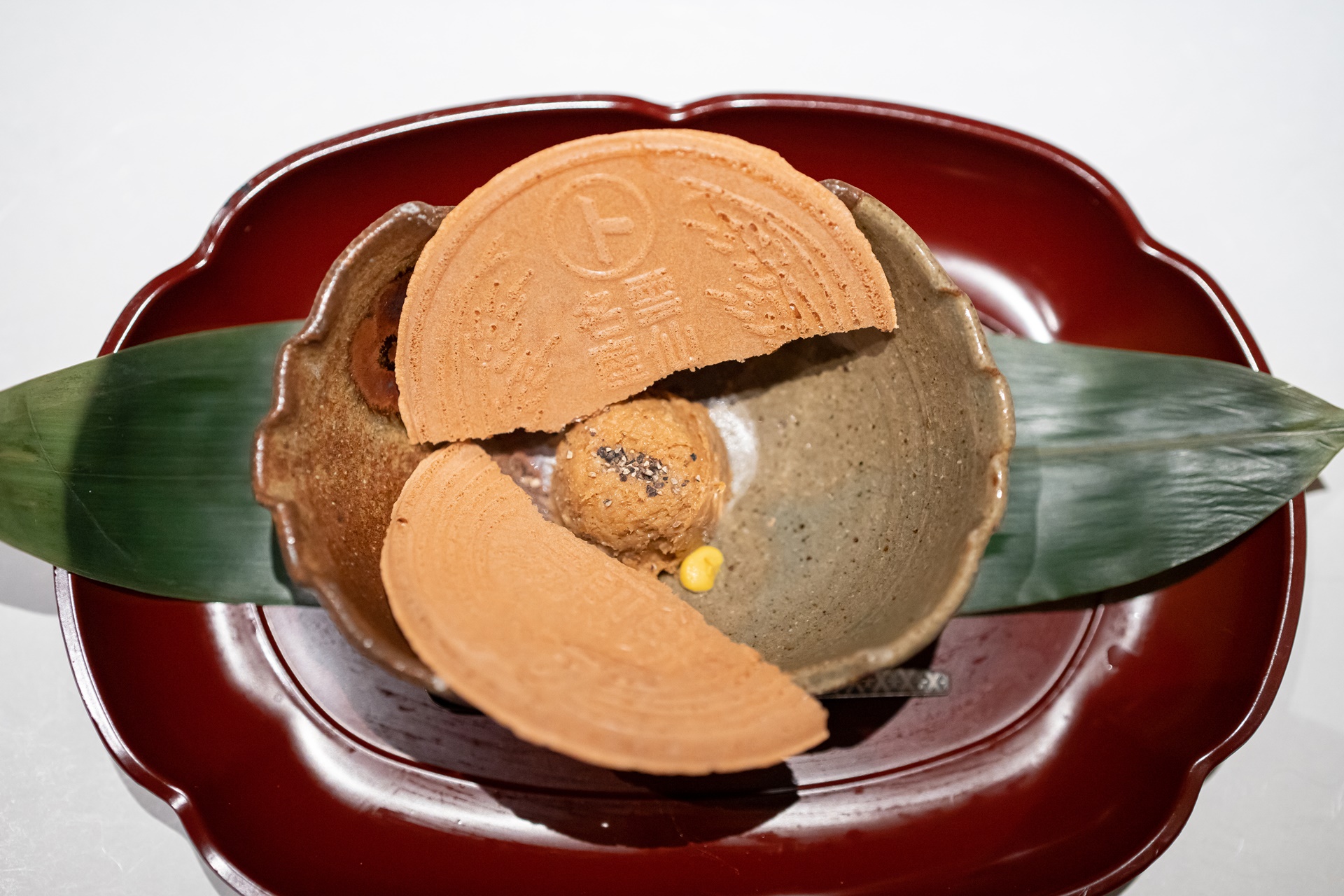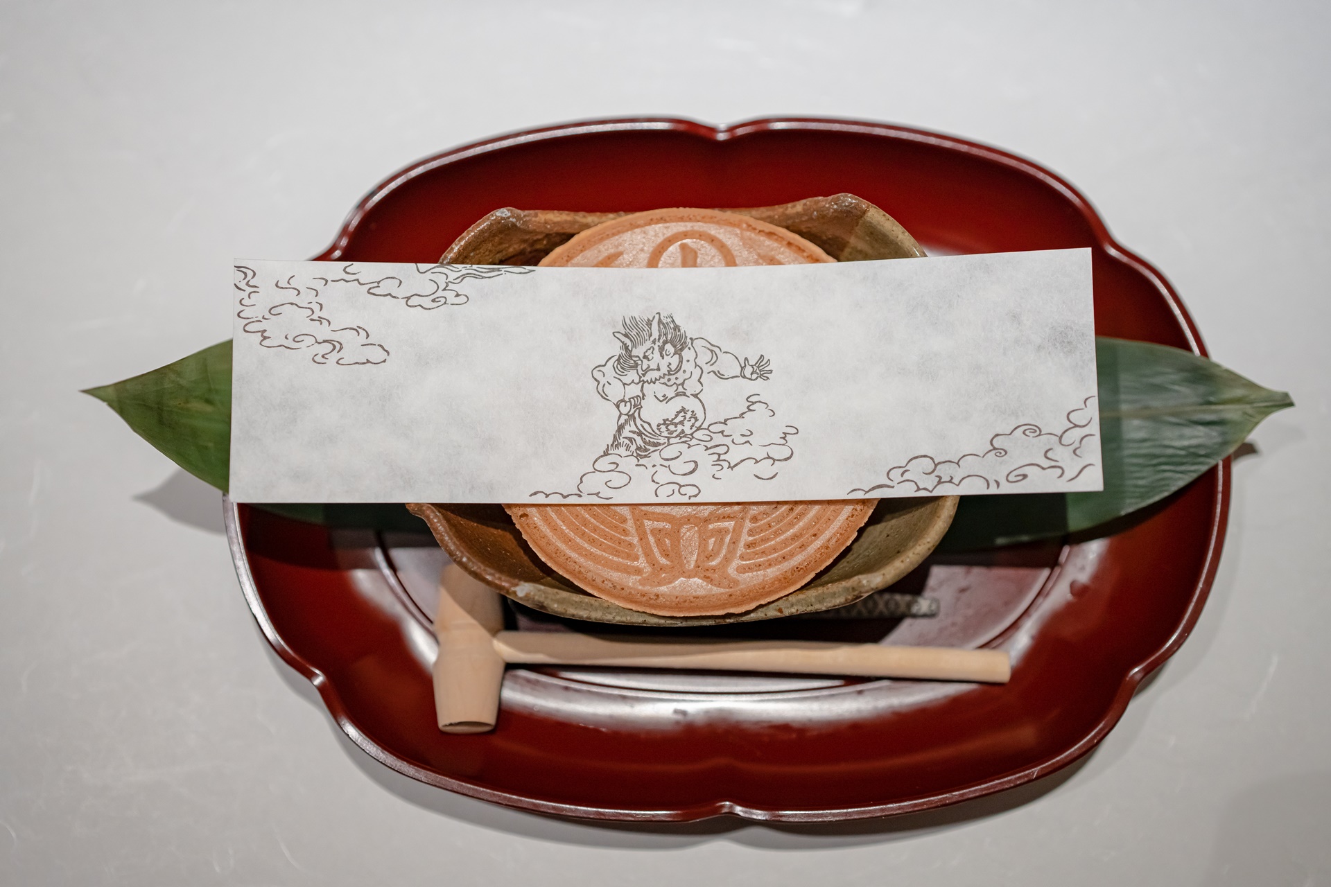 종이 뒤에는 운젠 온천 센베이가 있고 온천 센베이가 반으로 갈라지며 그 뒤에 숨겨져 있던 요리가 나옵니다.